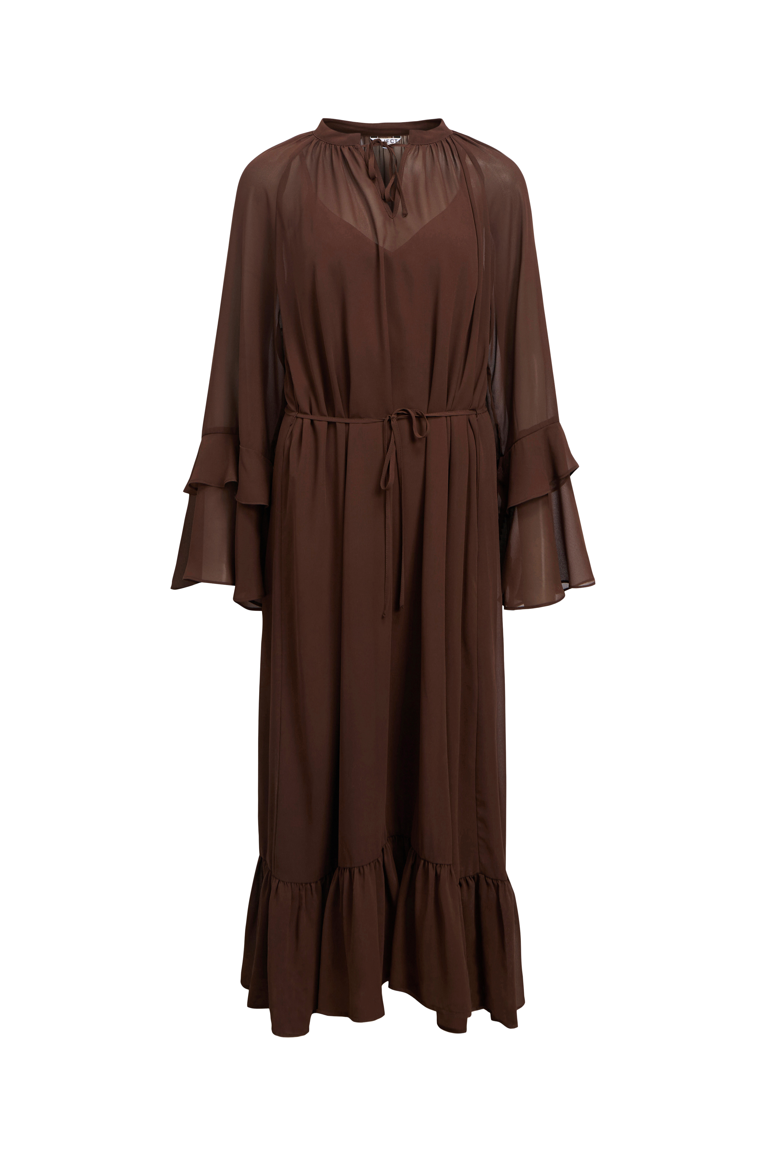 • Kjole med volanter• Gennemsigtigt materiale• Lille opretstående krave• Lange ærmer• Slids med bindbart bånd foran• Bindebånd ved taljen• Underkjole med justérbare skulderstropper• Løs pasform• Længde: 128 cm i størrelse 36