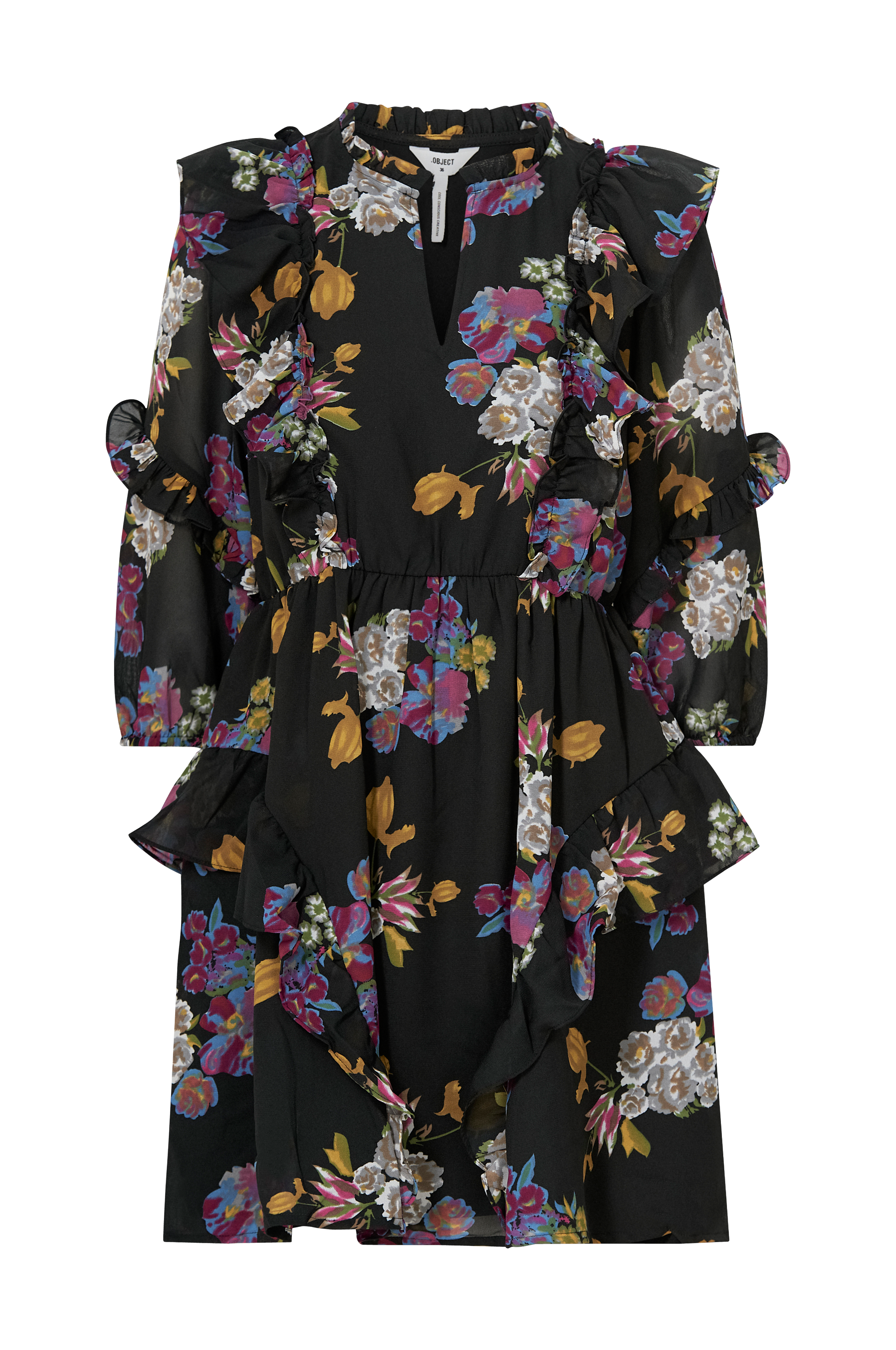 • Figurformede model i chiffon• Rund hals med volant• Volanter over skuldrene• Elastisk talje• Volanter på skørtet• Foret• Længde: 90 cm i størrelse 36