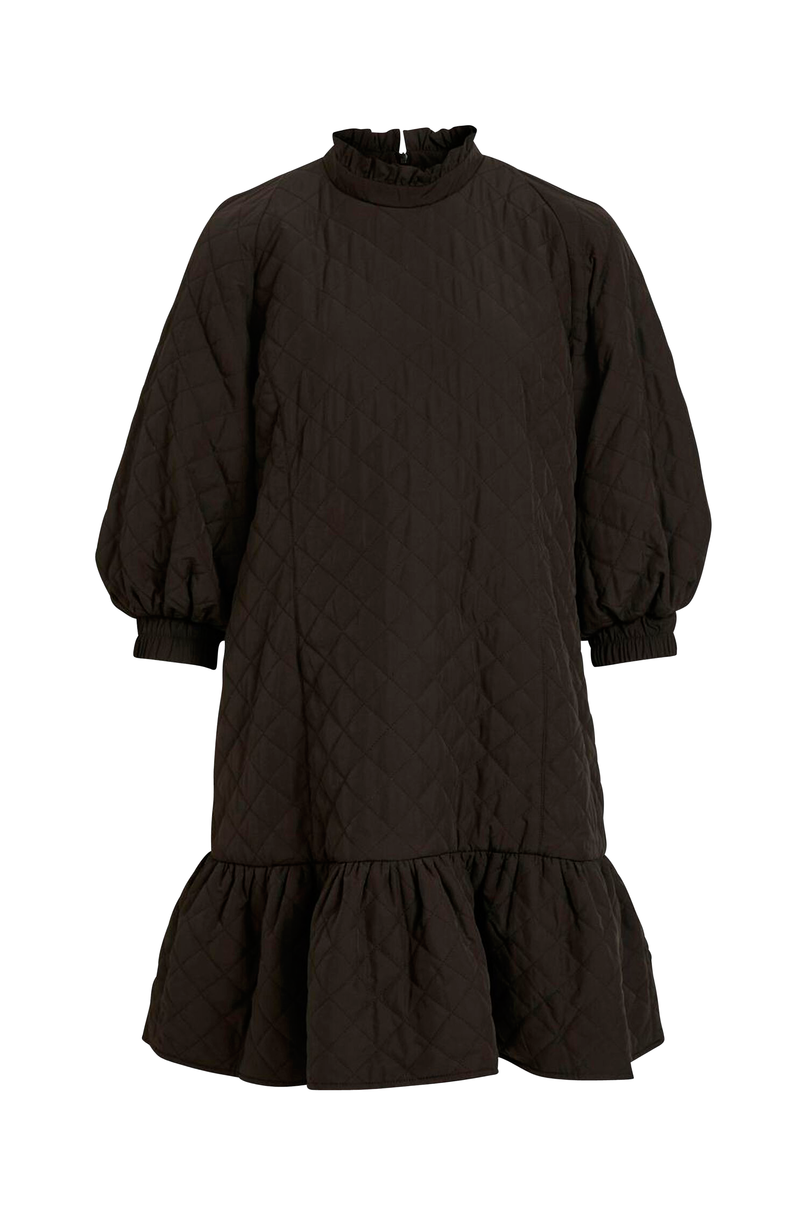 Kjole objPatty Dress 111 fra Object med quiltet design og let vattering. A-formet model med flæse forneden og 3/4-lange ballonærmer med elastik i ærmekant. Standkrave med flæsekant. Skjult lynlås i ryggen. Løs pasform. Længde ca. 92 cm i str. 36.