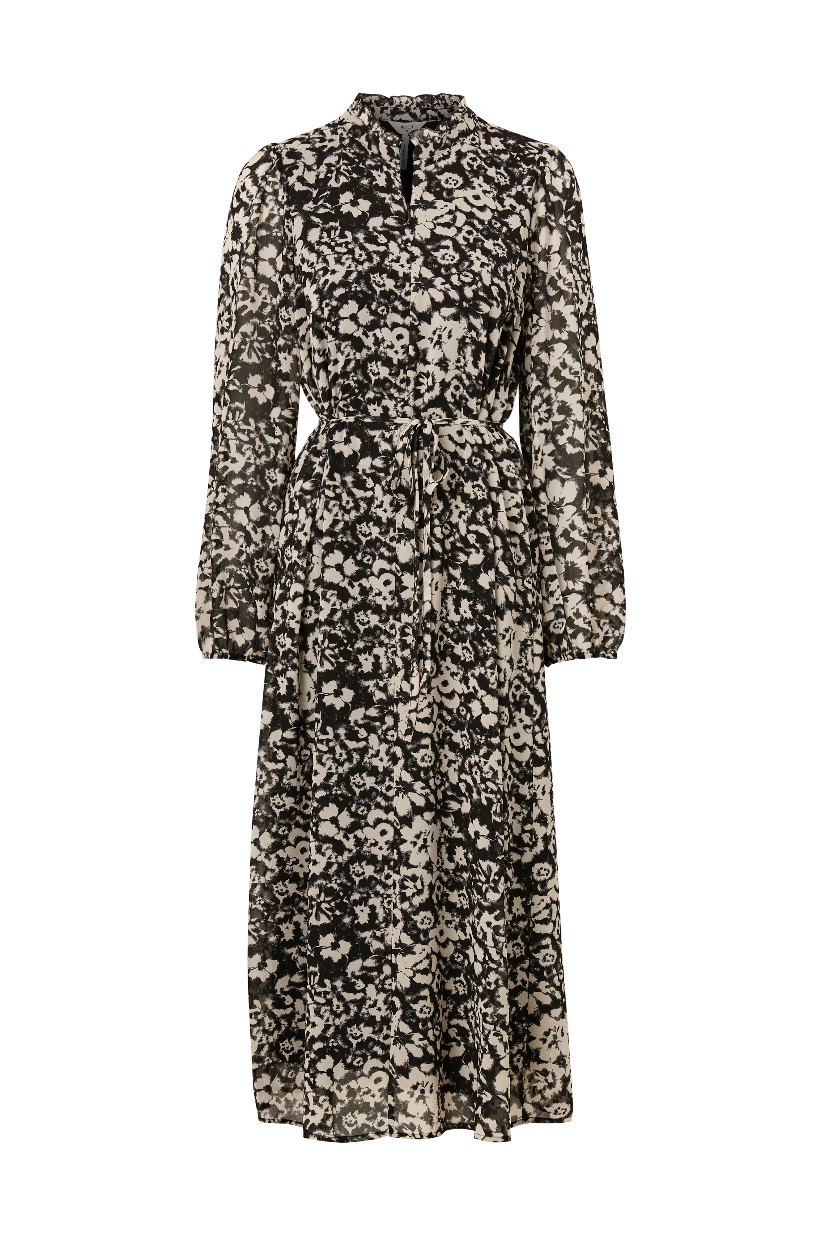 • Mønstret maxi kjole med sort for• Uforede, semitransparente ærmer• Rund halsudskæring med flæsekant hele vejen rundt• Kort lynlås oppe foran• Aftageligt, tyndt bindebælte ved taljen• Længde: 132 cm i størrelse 36