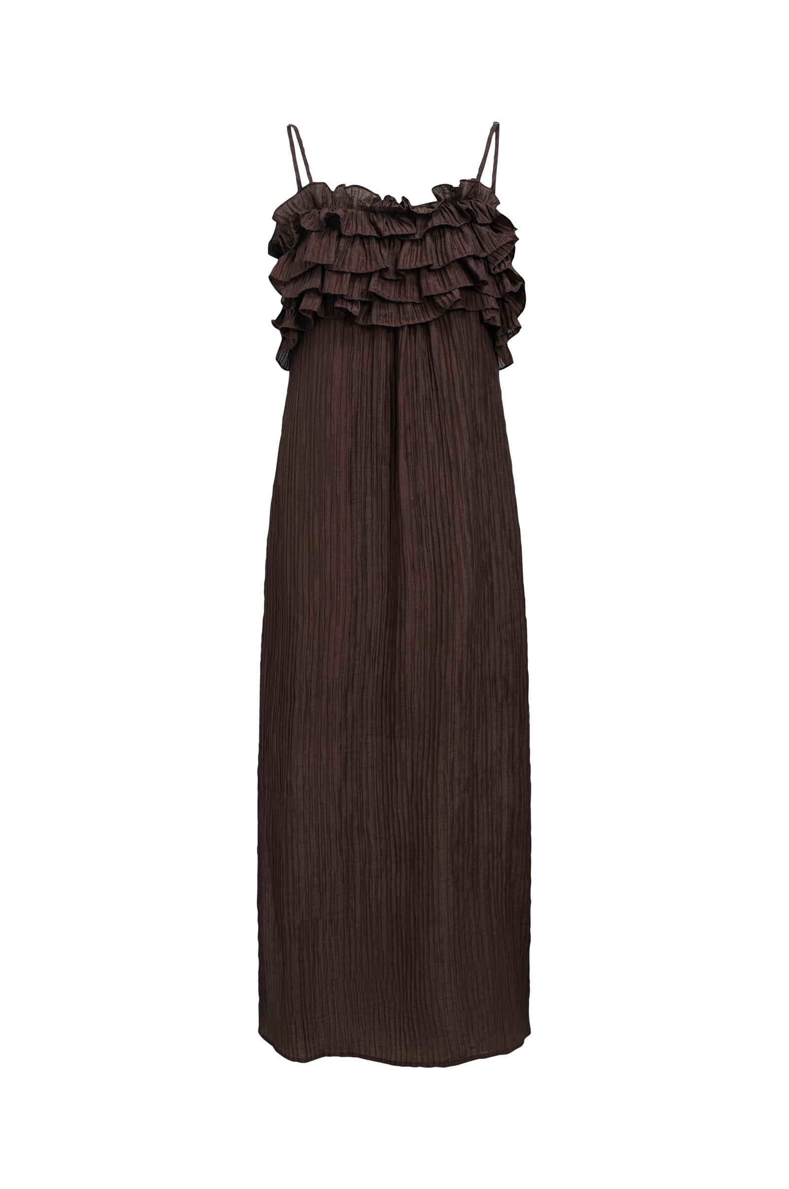 • Ærmeløs, foret maxi kjole i rynket materiale