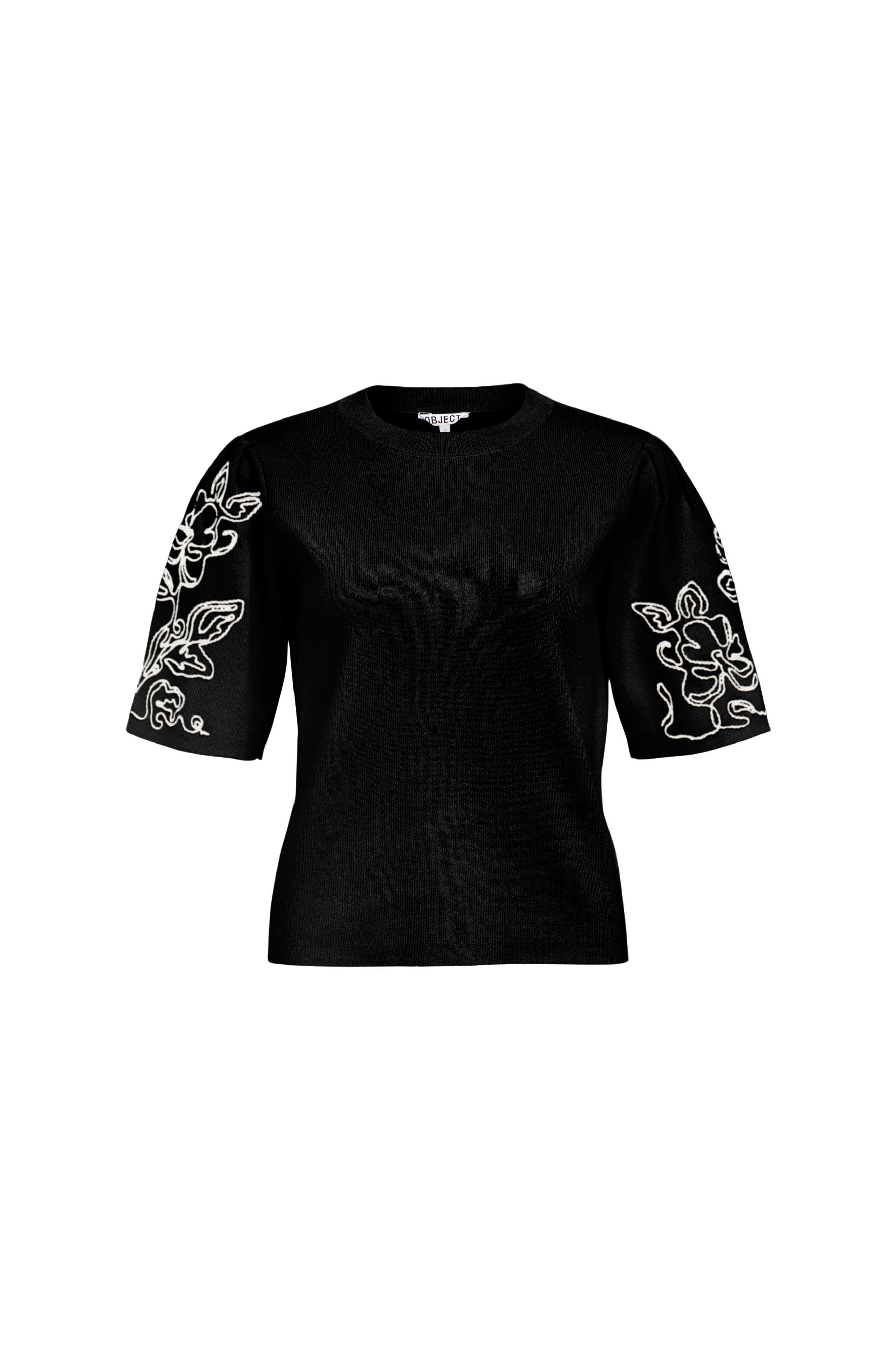 • Fintstrikket Pullover med halvlange pufærmer• Rund, ribbet halsudskæring• Dekorativt broderi på ærmerne