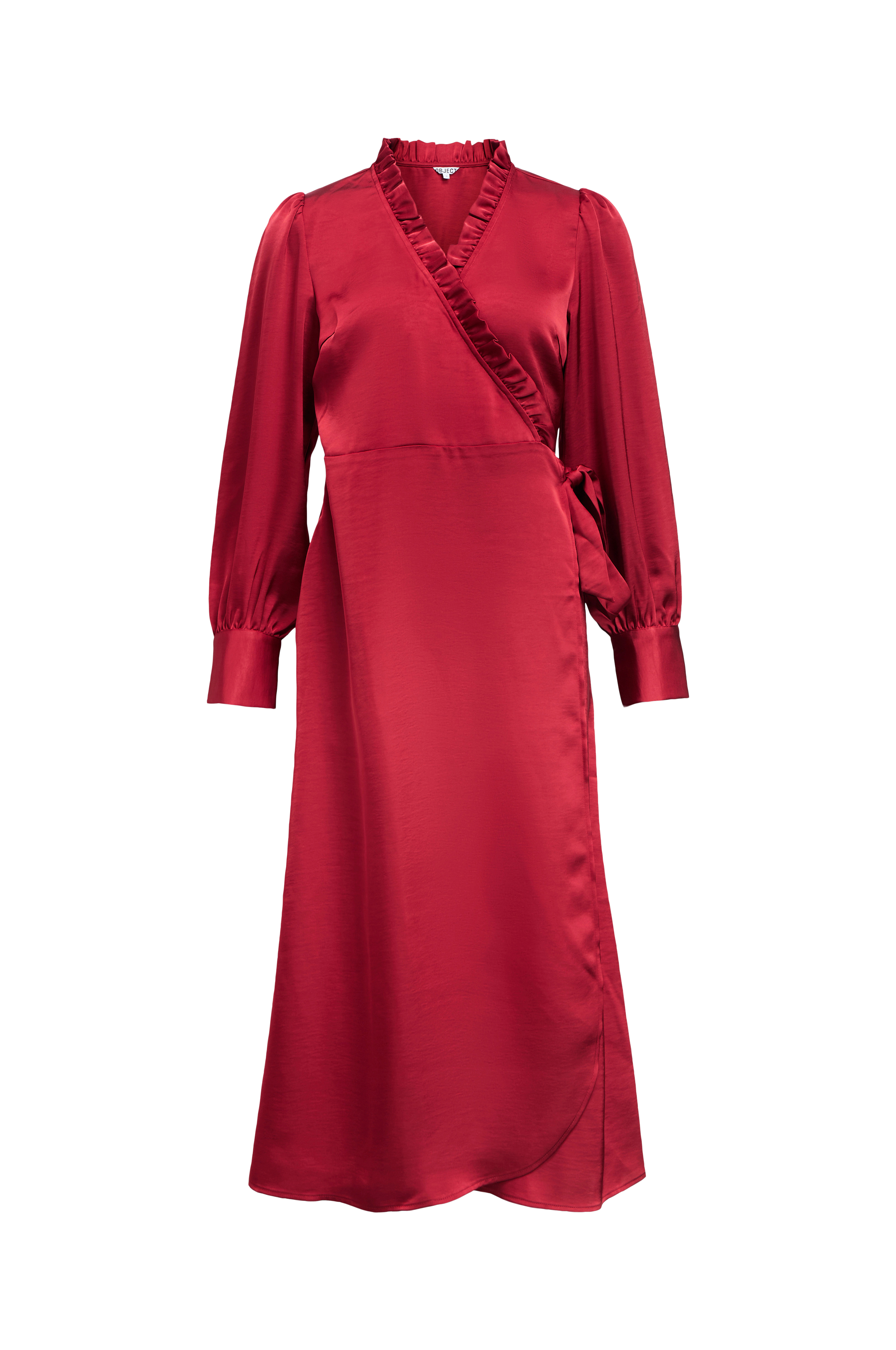 • Midikjole i satin med slå-om design• V-formet halsudskæring med flæsekant• Lange pufærmer med manchetter ved manchetterne• Længde: 126 cm i størrelse 36