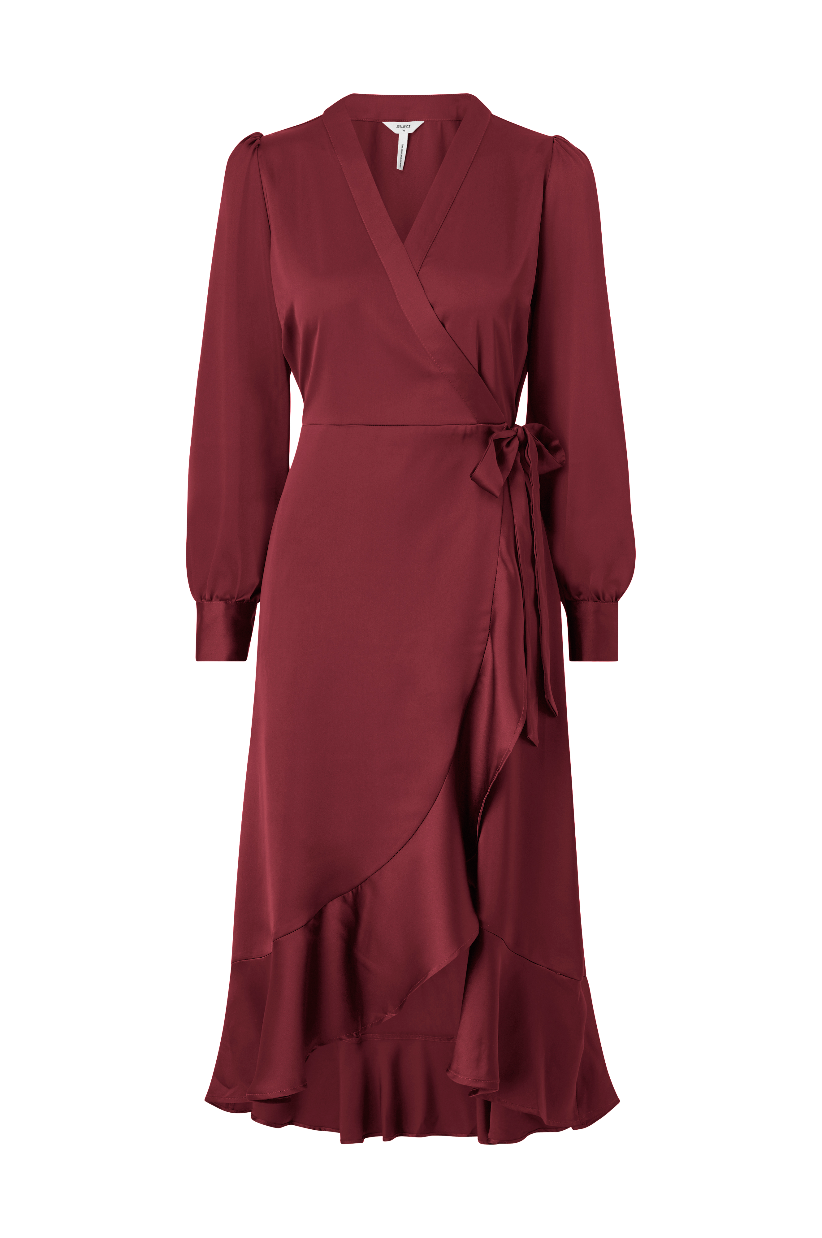 • Lang, langærmet slå-om kjole i skinnende satin• Ballonærmer med manchet med to knapper ved manchetterne• V-formet halsudskæring• Flæsedesign nederst• Tøjet er længere bagpå end foran• Længde: 116 cm i størrelse 36