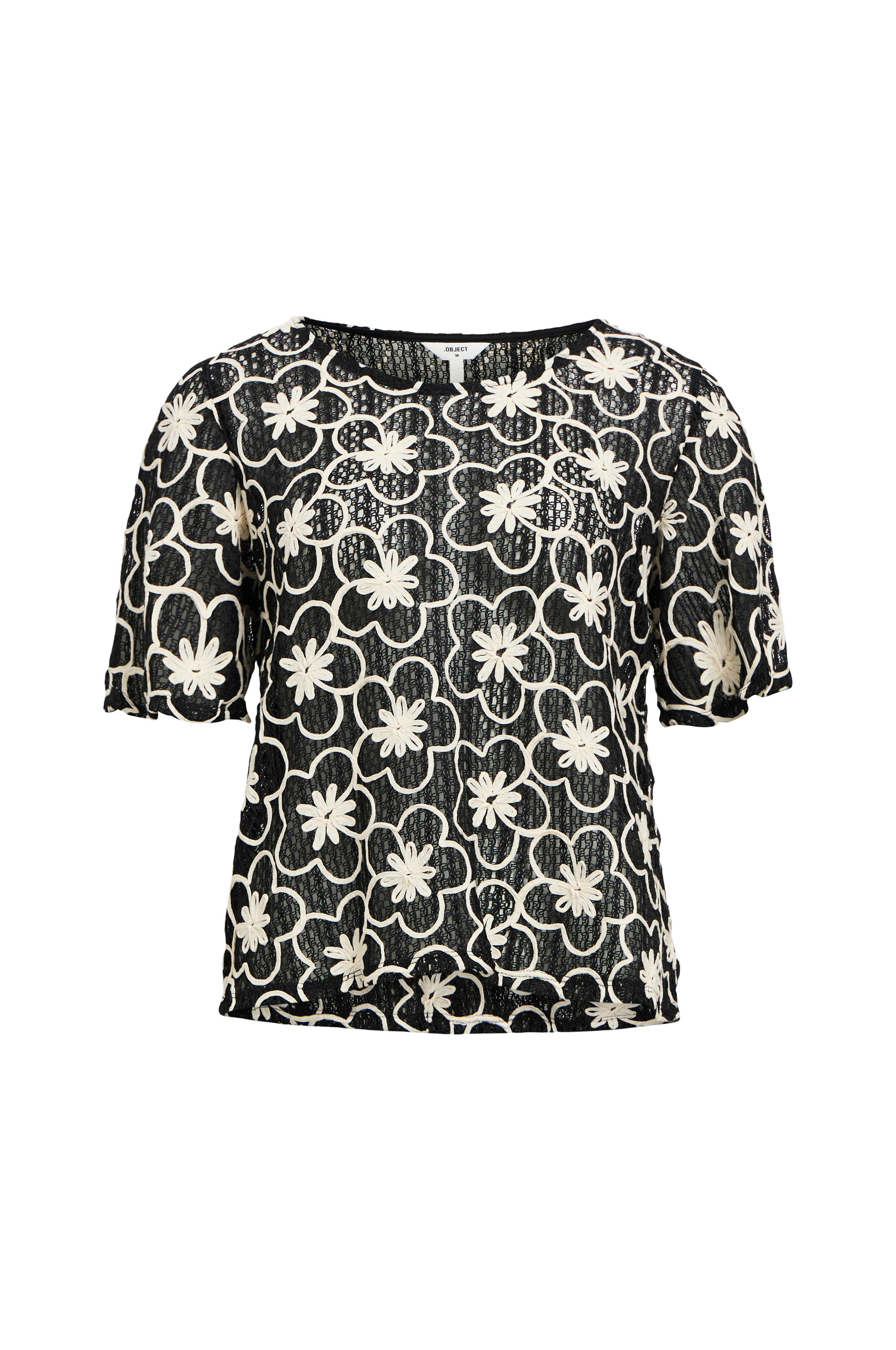 • Lige, lidt transparent model• Blomstrede applikationer overalt• Rund hals• Kort ærme