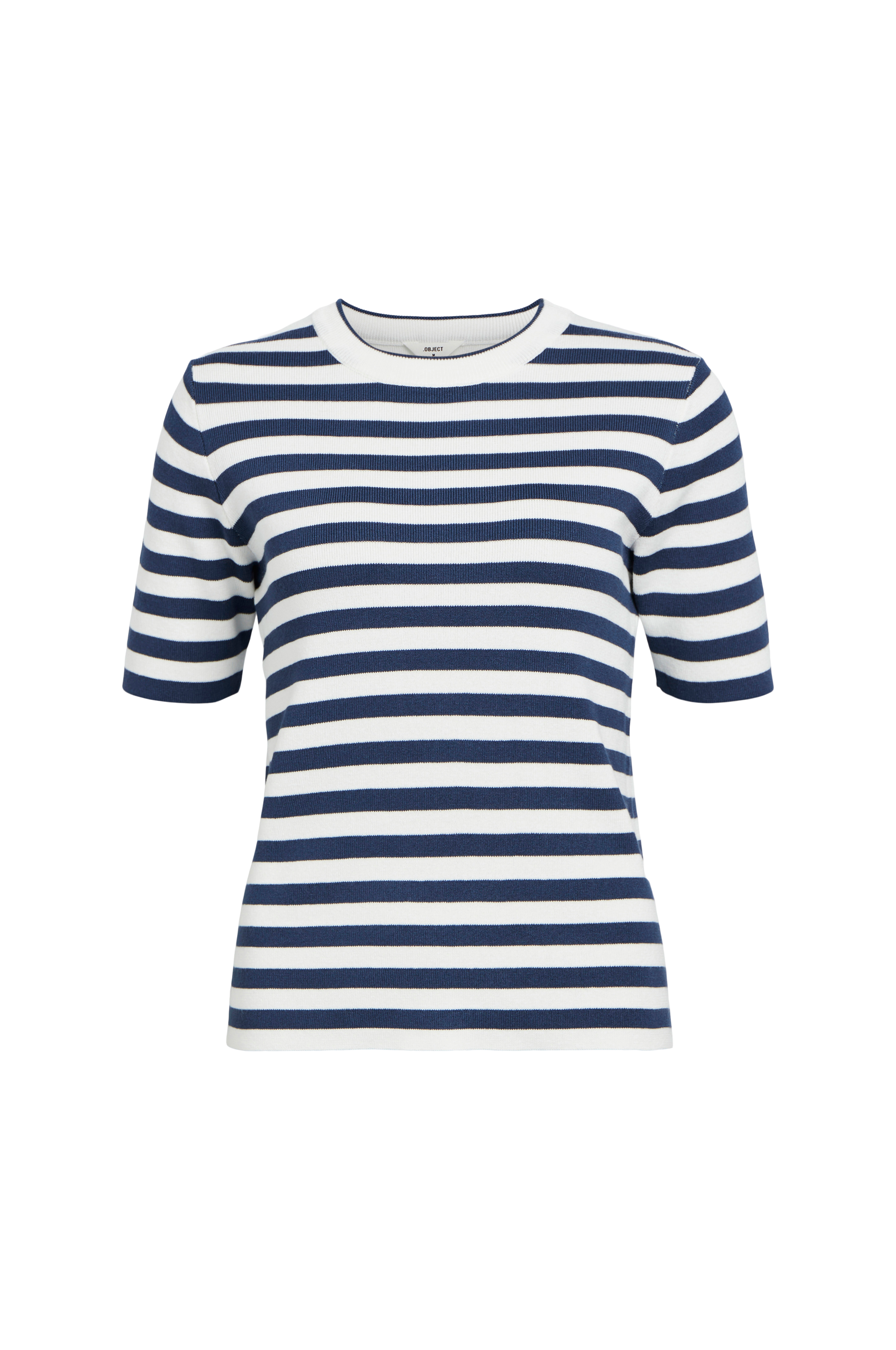 • Model med strikkede striber• Kort ærme• Rund hals med ribkant