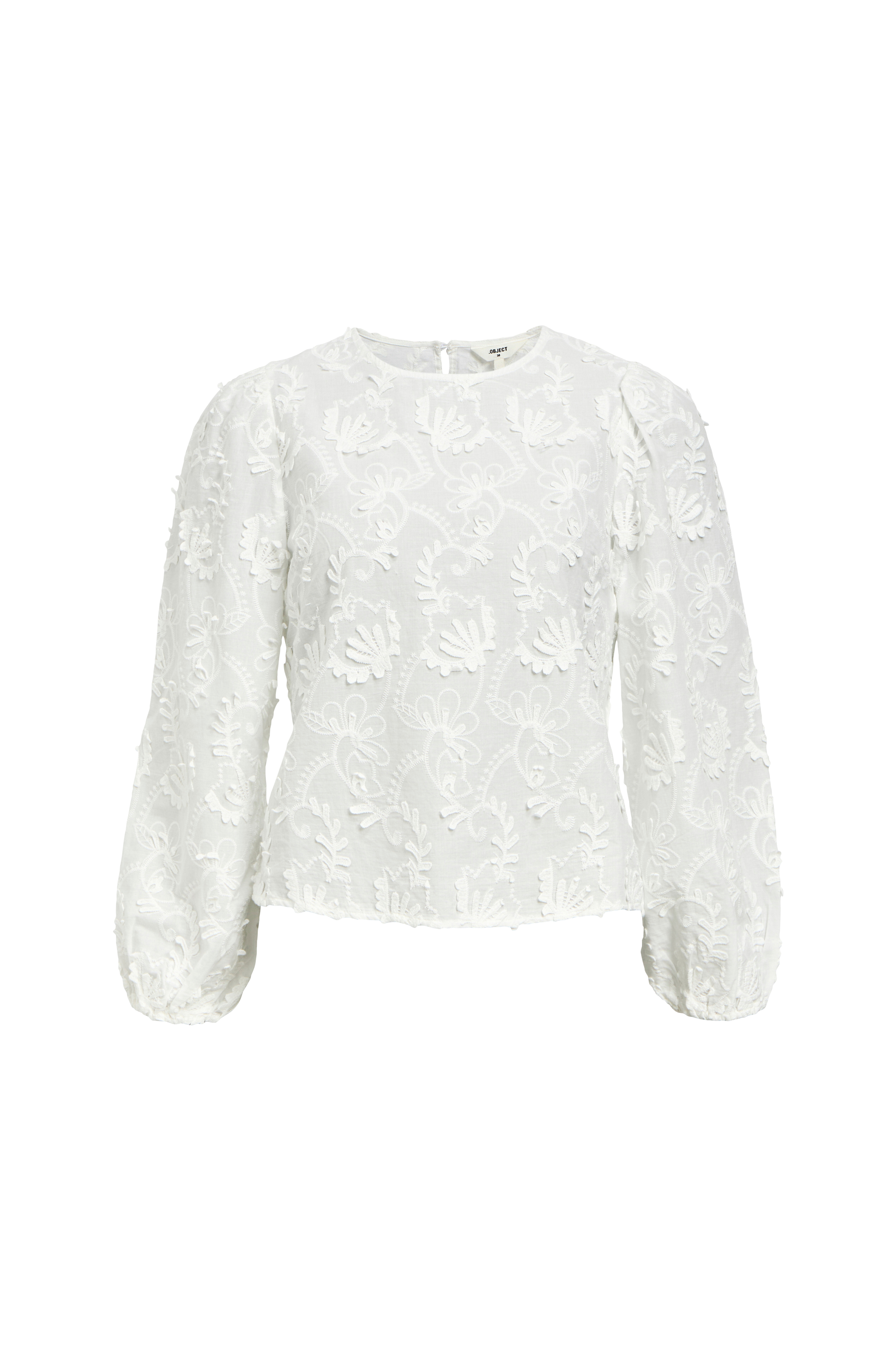 • Langærmet top i luftigt, let, semitransparent materiale med broderet mønster• Ballonærme med elastik ved manchetterne• Afrundet halsudskæring• Åbning i ryggen med tre dekorative knapper