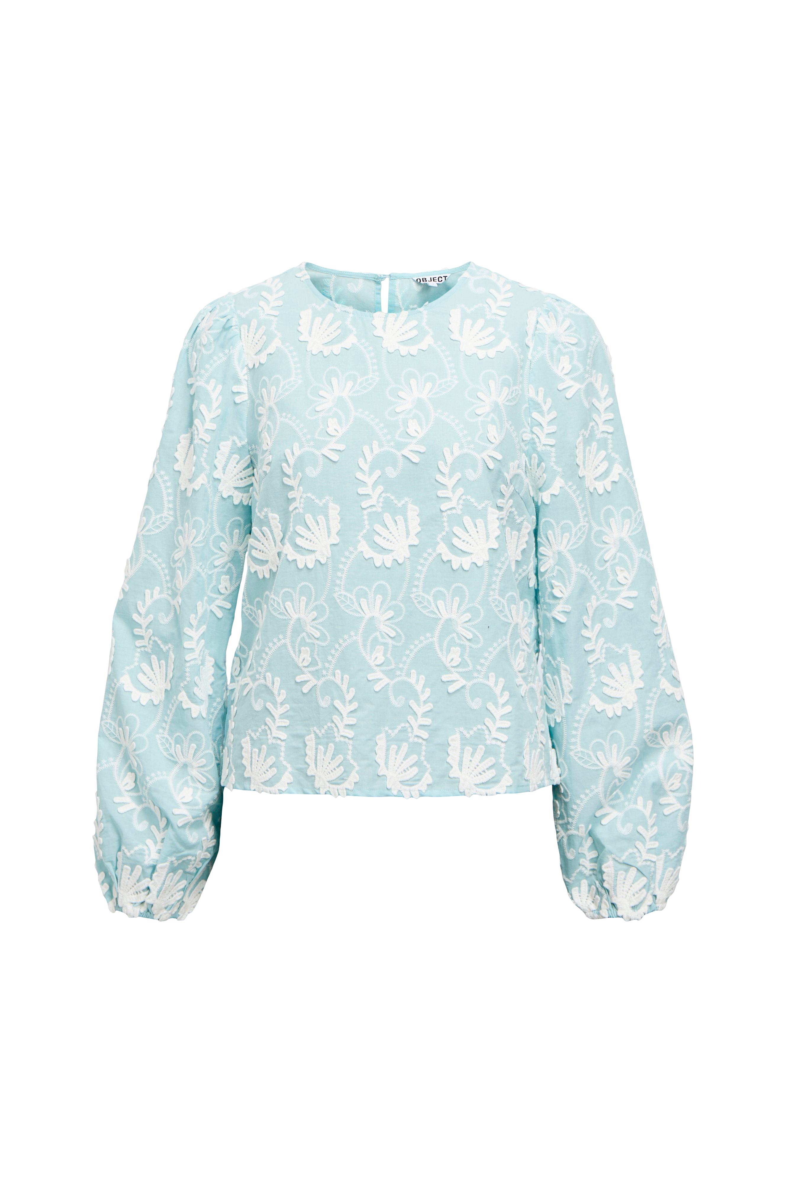 • Langærmet top i luftigt, let, semitransparent materiale med broderet mønster• Ballonærme med elastik ved manchetterne• Afrundet halsudskæring• Åbning i ryggen med tre dekorative knapper