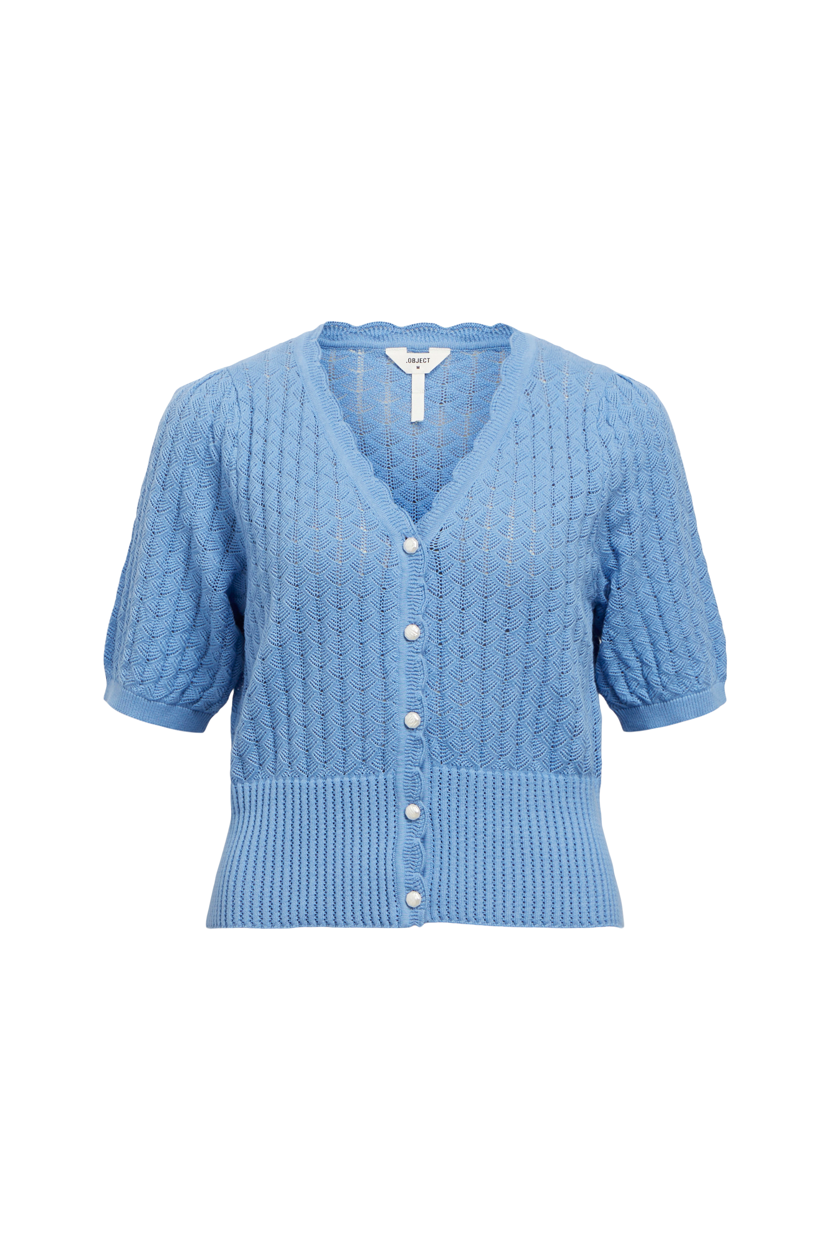 • Mønsterstrikket model• V-formet halsudskæring med bølget kant• Dekorative knapper foran• Kort ballonærme med ribkant ved ærmeafslutningerne• Bred ribstrik nederst