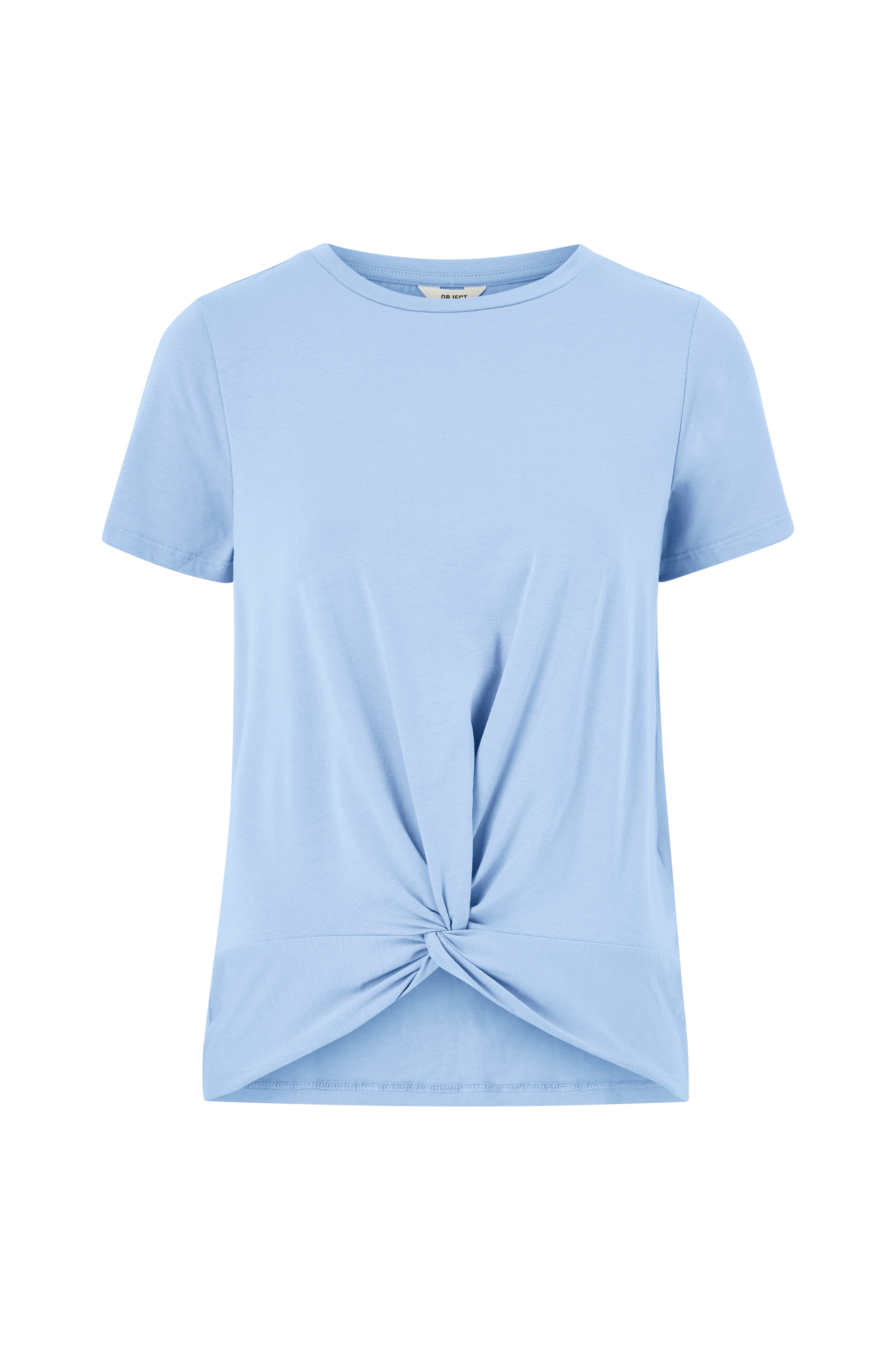 Kortærmet top i blød jersey med knudedrapering forneden. Rund hals med ribkant.