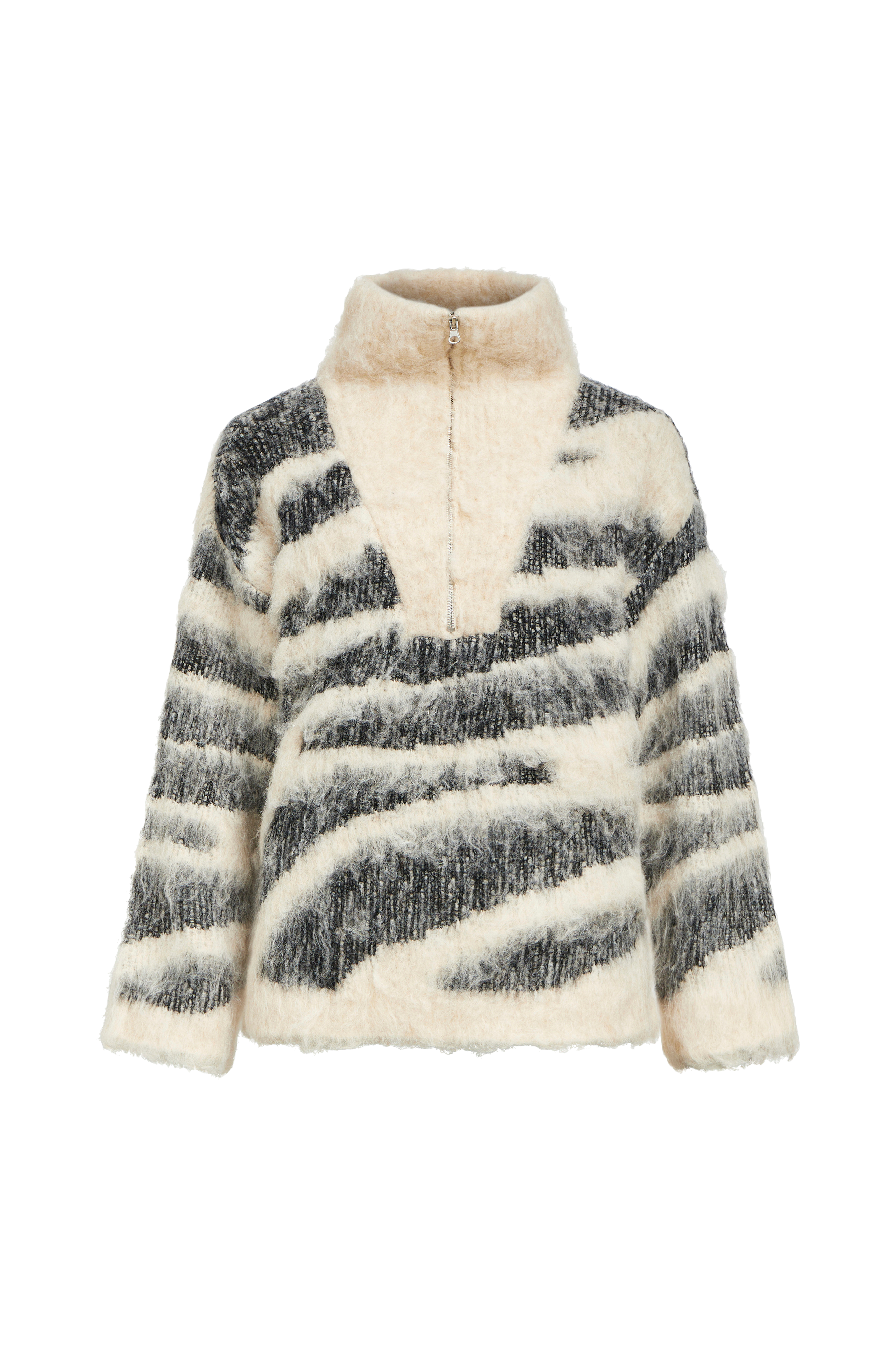 • Høj, ribstrikket krave med halvlang lynlås foran
