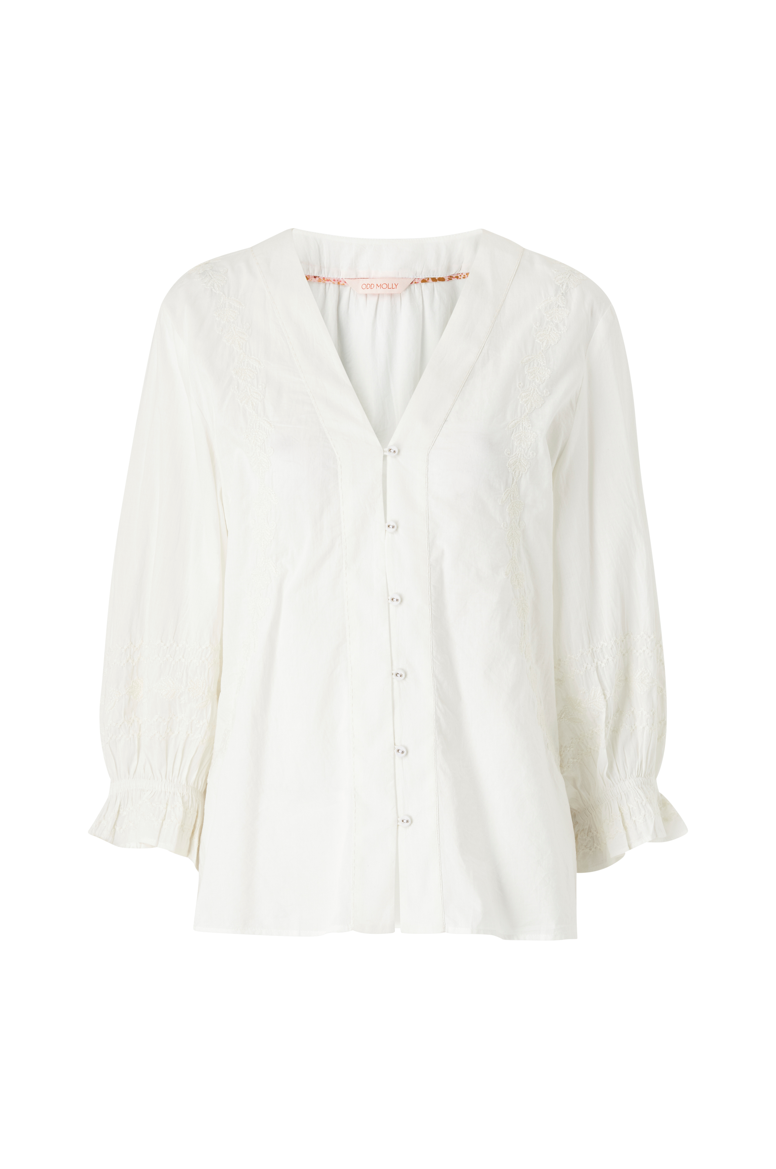 • V-udskæring• Knapper foran• Broderet mønster• Ballonærmer med volant