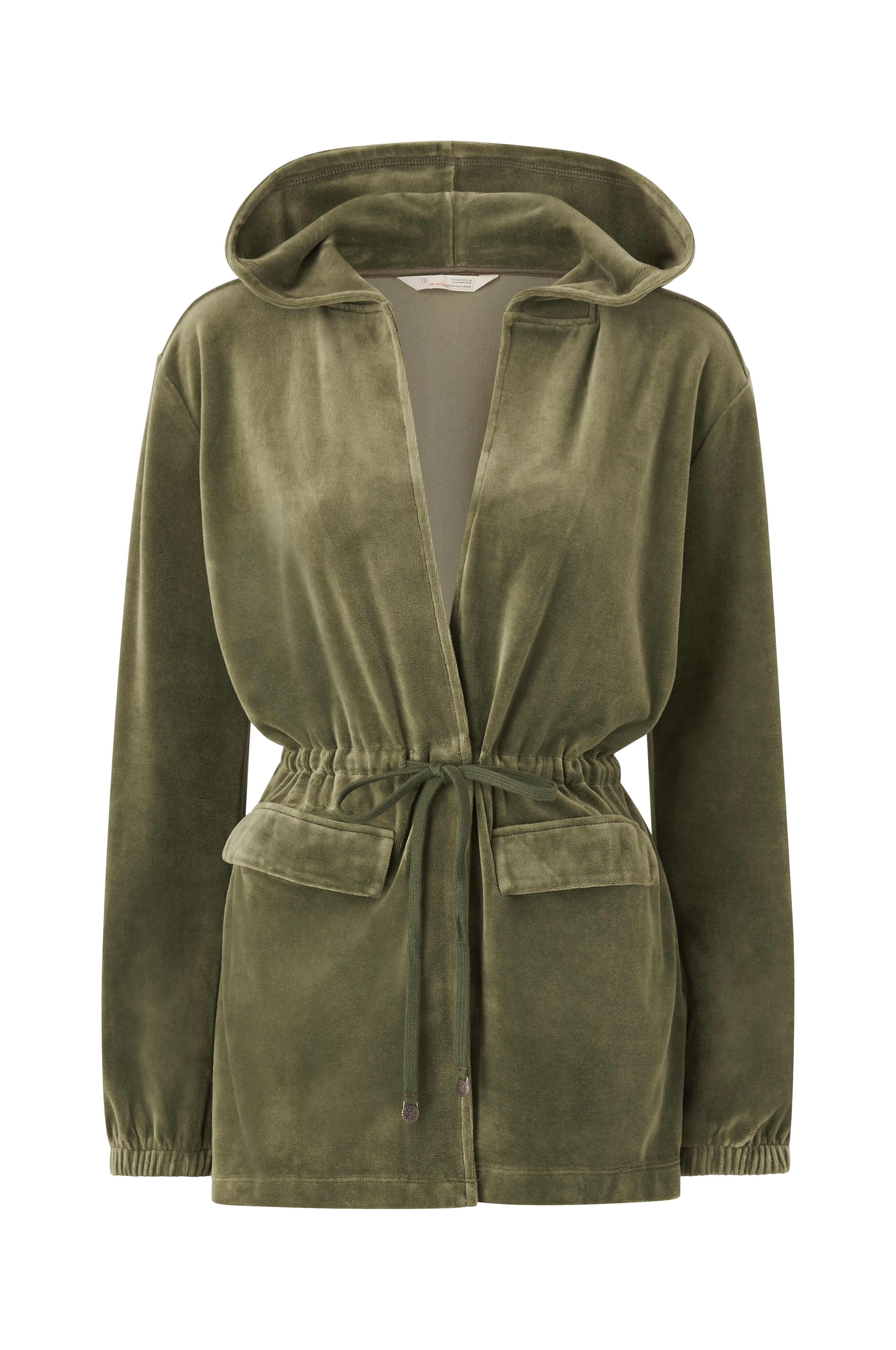 • Model i fløjl med en skjult trykknap foran• Træksnørre ved taljen• Indlagte lommer med låg• Langt ærme med elastik ved manchetterne