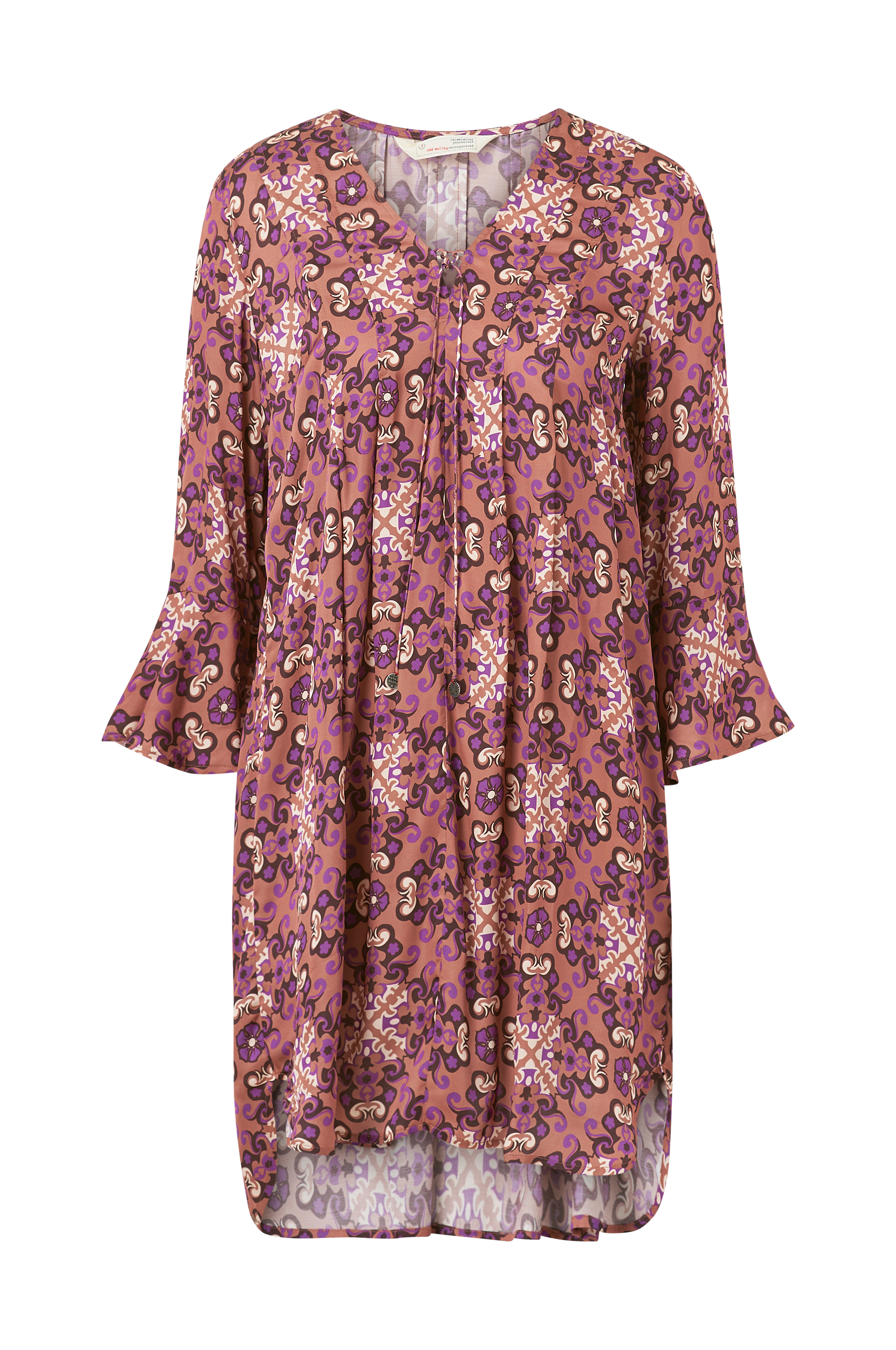 Kjole Georgine Tunic fra Odd Molly. A-formet model i vævet satin med V-formet halsudskæring og smalt bindebånd. Delesømme foroven med lagte læg nedenfor både foran og bagpå. Langt ærme med påsyet flæse i ærmekant og afrundet kant forneden med slids i siderne. Længde ca. 93 cm i str. 1.