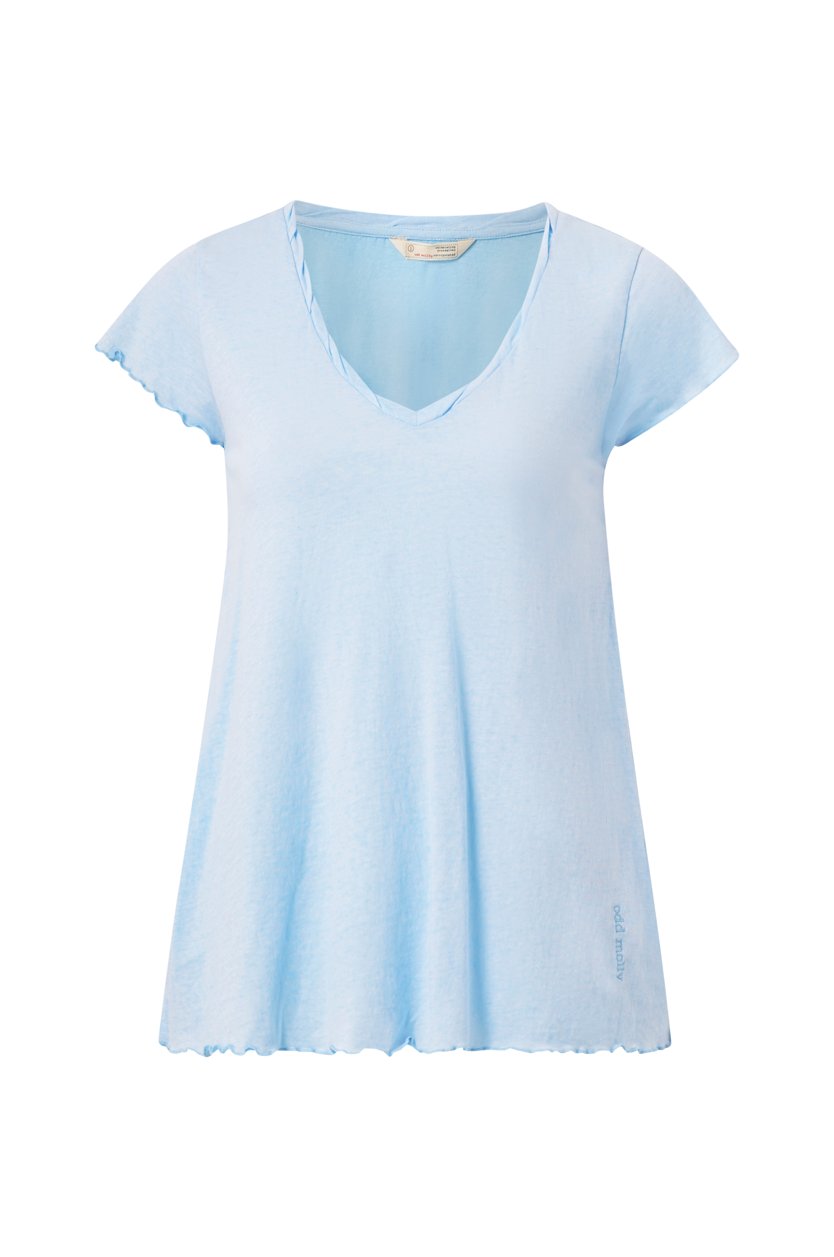 • Korte ærmer • V-udskæring med tvistet kant • A-linje design • Bølget kant ved manchetterne og nederst • Produktet indeholder økologisk bomuld, som er dyrket uden kemiske sprøjtemidler, kunstgødning og genmodificerede afgrøder (GMO). Dette betyder et sundere arbejdsmiljø for landmænd og bedre jord.