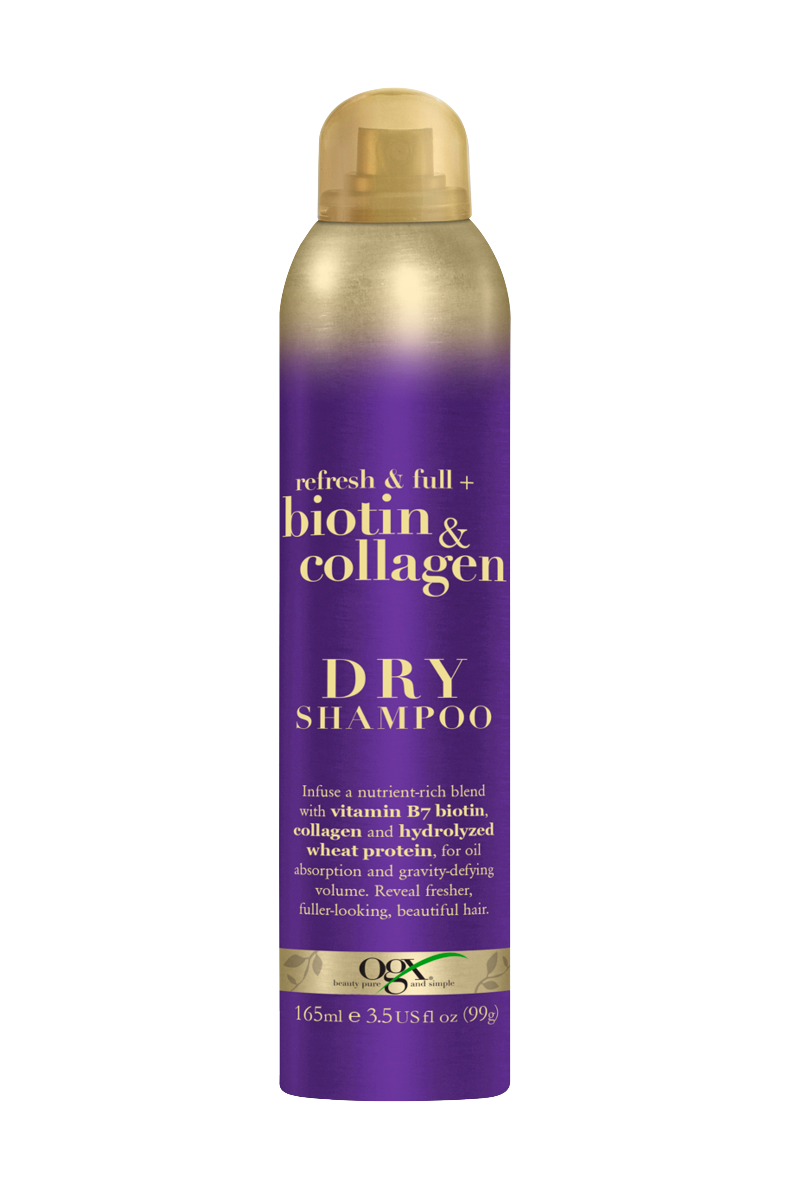 OGX Biotin & Collagen Dry Shampoo kan hjælpe dig med at give volumen, skabe struktur og fjerne overskydende hårfedt. Den indeholder en nærende blanding som opfrisker ved hjælp af vitamin B7 biotin, kollagen og hydrolyseret hvedeprotein.