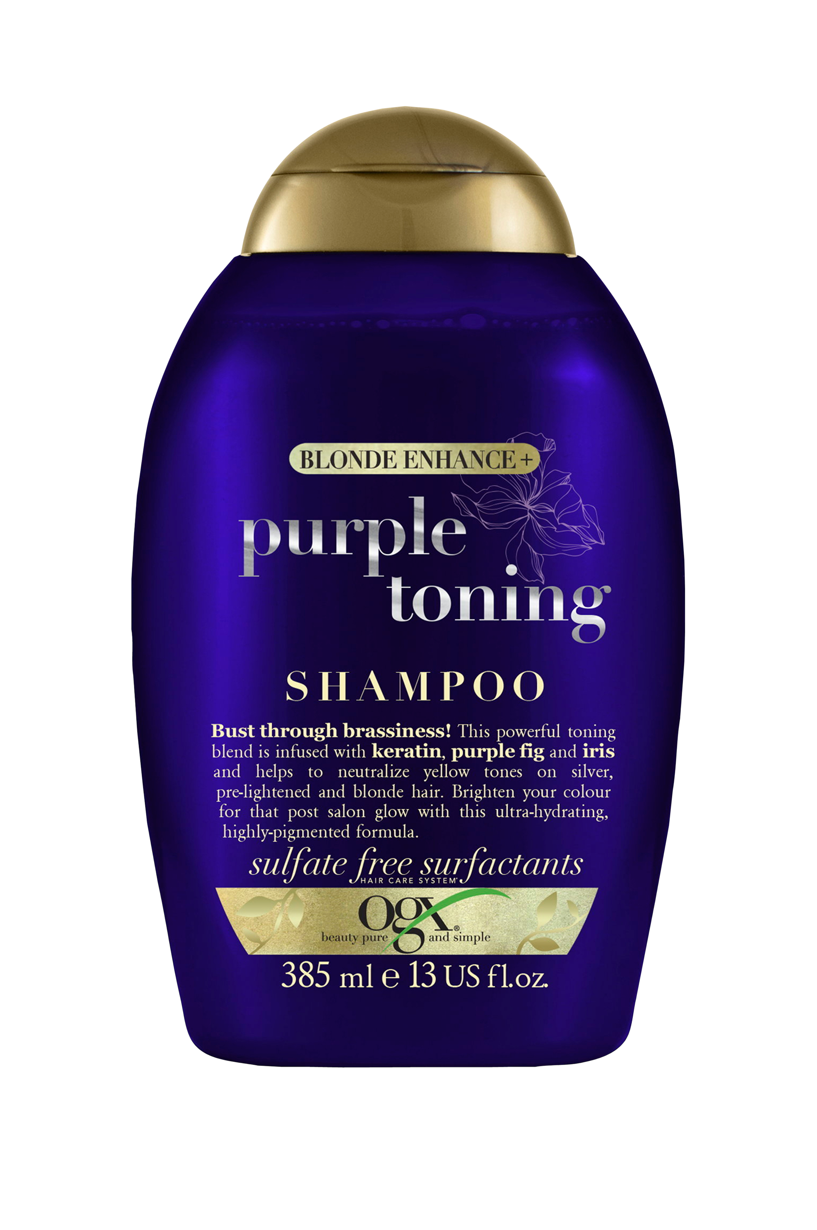 Tag kontrollen med kobbertonede nuancer med OGX Blonde Enhance + Purple Toning Shampoo, en kraftfuld toningsblanding fyldt med keratin, lilla figen og iris, som gør, at håret ser lysere ud efter bare en enkelt gangs brug. Resultatet bliver et fugtet, blankt og mere frisk hår takket være de kolde pigmenter. Jo mere du bruger denne shampoo, desto mere hjælper det med at bevare din blonde tone mere lys og kold.