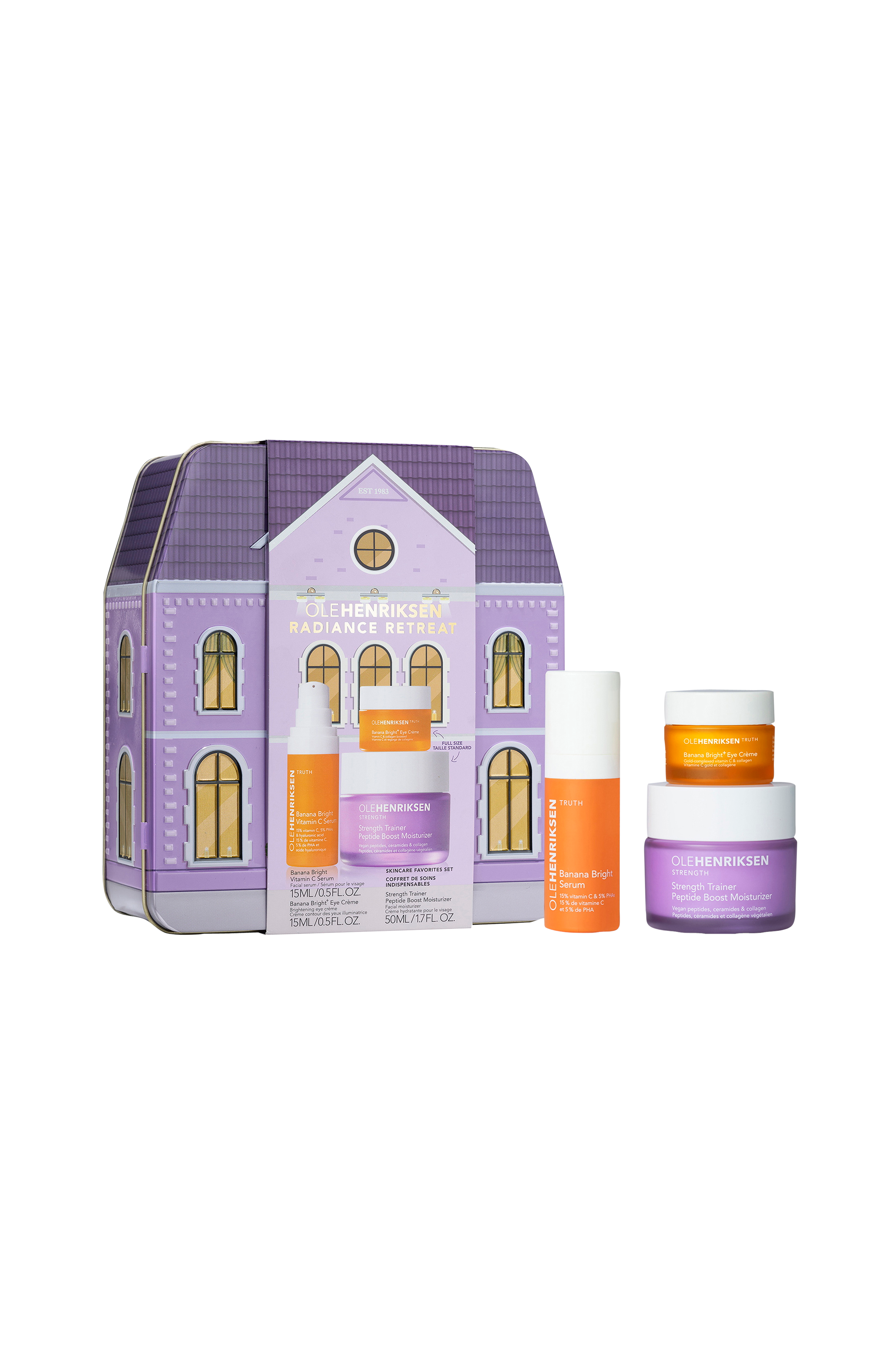 Dette Radiance Retreat-sæt har alt hvad du behøver for en vidunderlig spa-oplevelse. Få strålende og frisk hud med denne effektive 3-trins rutine. Start rutinen med det populære Banana Bright Vitamin C Serum for at lysne og jævne hudtonen, og påfør derefter Strength Trainer Peptide Boost Moisturize for at fugte og styrke huden. Afslut med Banana Bright+ Eye Crème for at minimere mørke rande og smilerynker.
