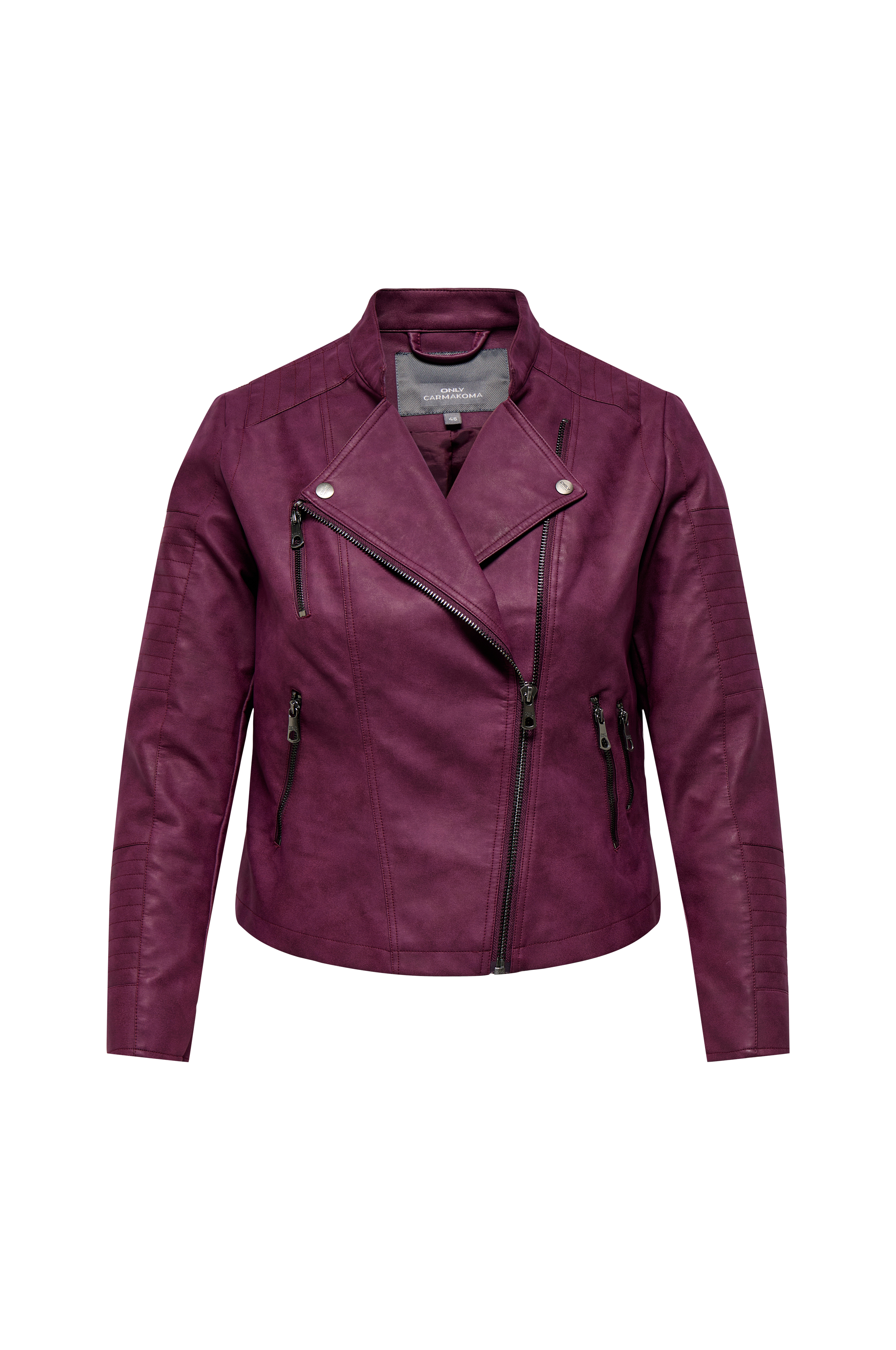 Bikerjakke carAvana Faux Leather fra Only Carmakoma. Flot model med lille kravekant og revers med trykknapper og skrå lynlås. Pyntestukne indsatse på skuldre og ærme samt to pyntelynlåse og to lommer med lynlås foran. Pyntestukne sømme og lynlås i ærmekanten. Kvalitet i imiteret skind med vævet for. Længde ca. 59 cm i str. 44.