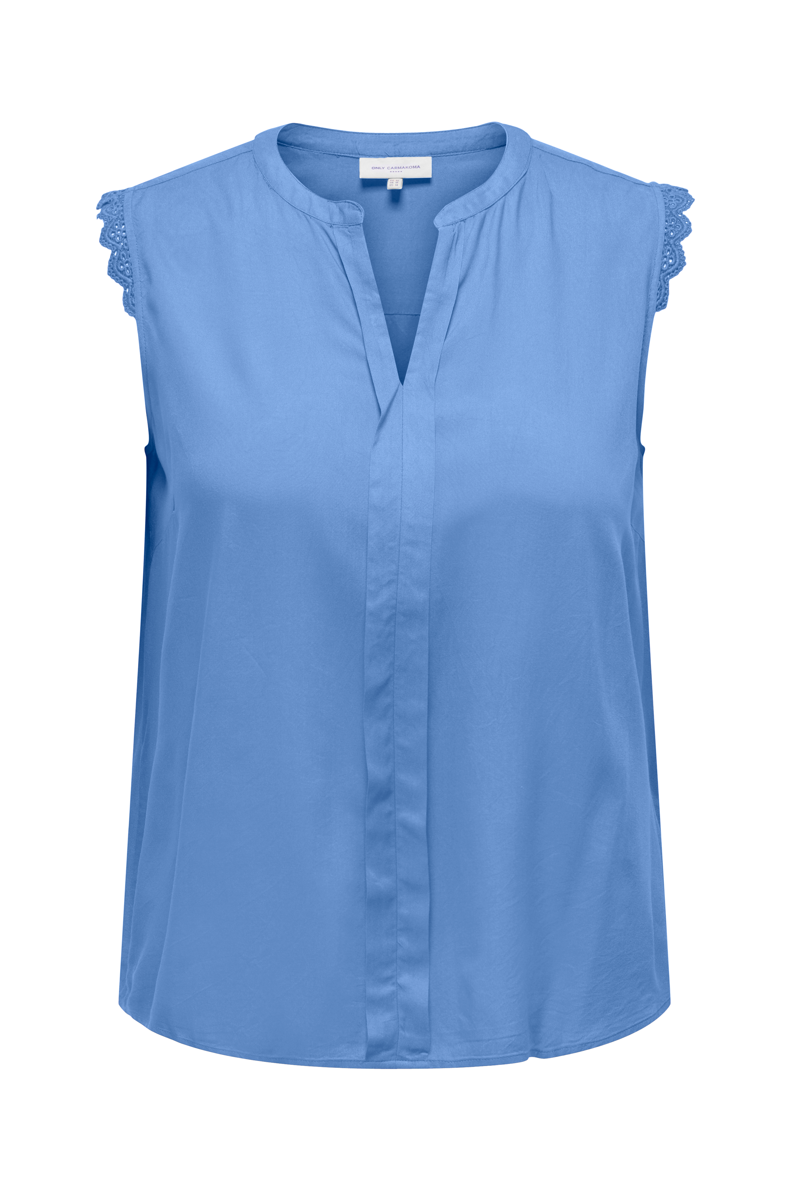 Bluse carMumi SL Top fra Only Carmakoma i vævet viskosekvalitet med blødt fald. Lige, vid og ærmeløs model med blondekant i ærmegab foroven. V-formet halsudskæring. Ingen knapper.
