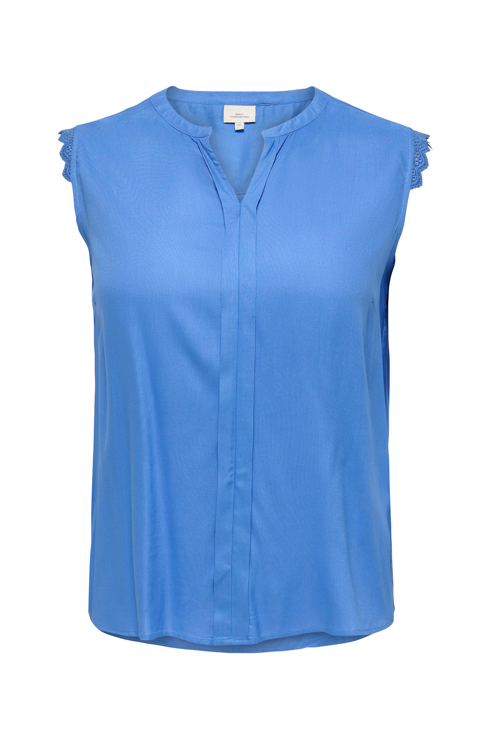 Bluse carMumi SL Top fra Only Carmakoma i vævet viskosekvalitet med blødt fald. Lige, vid og ærmeløs model med blondekant i ærmegab foroven. V-formet halsudskæring. Ingen knapper.