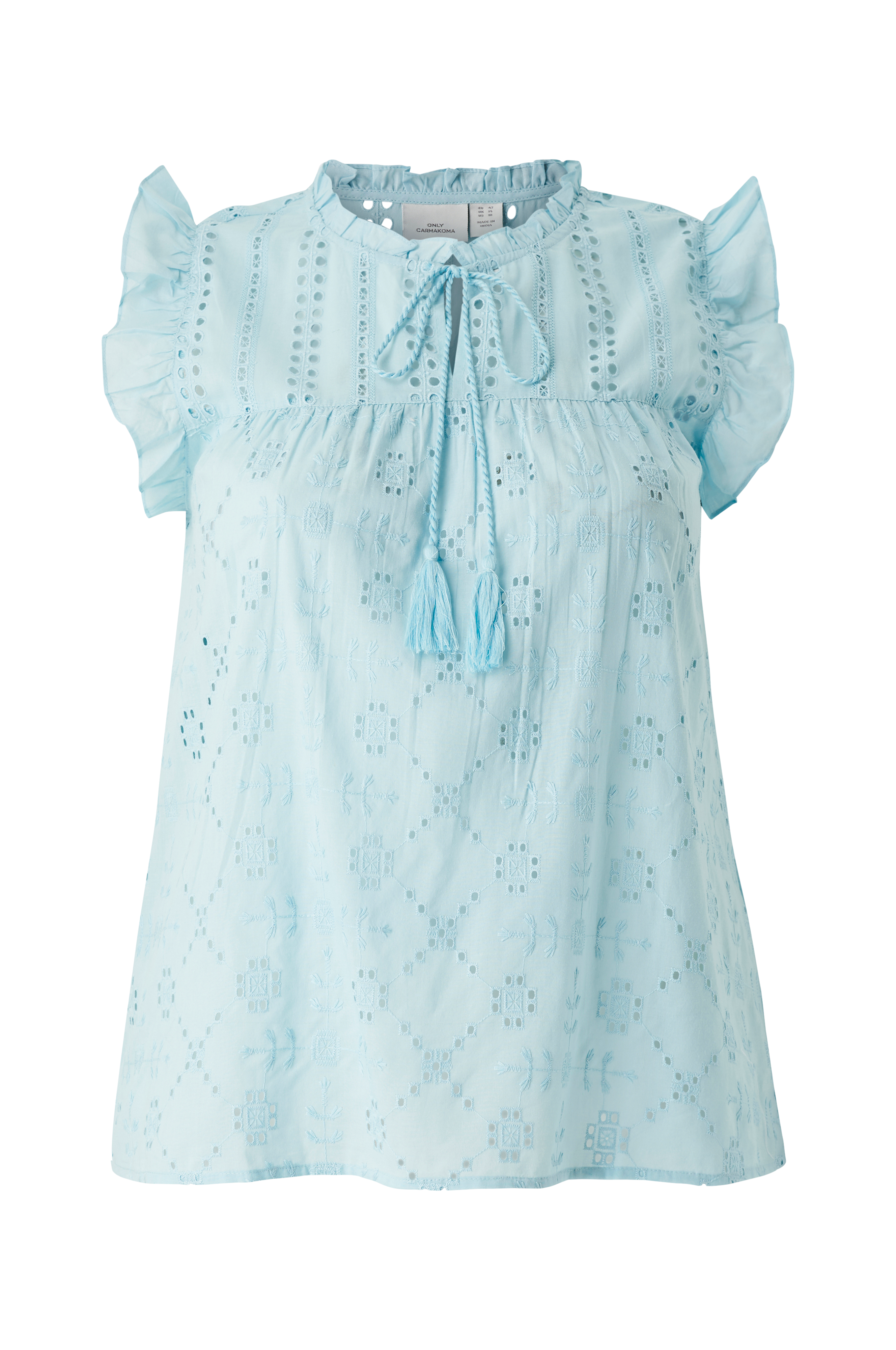 • Ærmeløs bluse med broderet hulmønster• Volanter omkring ærmeåbningerne• Volant i halsen• Ventilation med bindebånd med kvaster foran• Store størrelser