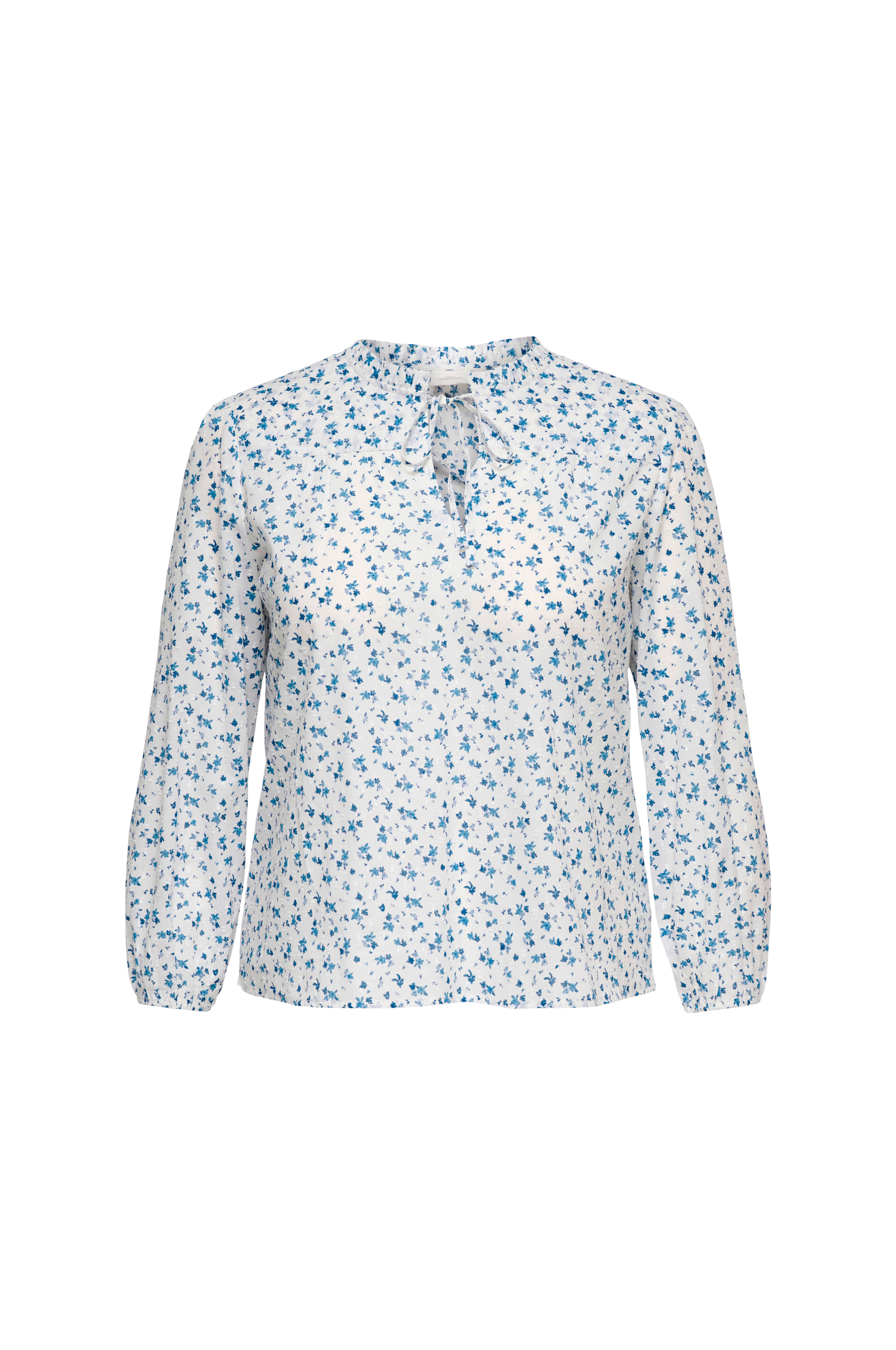 • Bluse i bomuld med et blomstermønster og strukturprikker hele vejen rundt • Rund halsudskæring med flæsekrave • Nøglehulsudskæring med knudedetalje • Lange pufærmer med elastiske ærmeafslutninger • Rynket udskæring oppe foran og i ryggen • Store størrelser