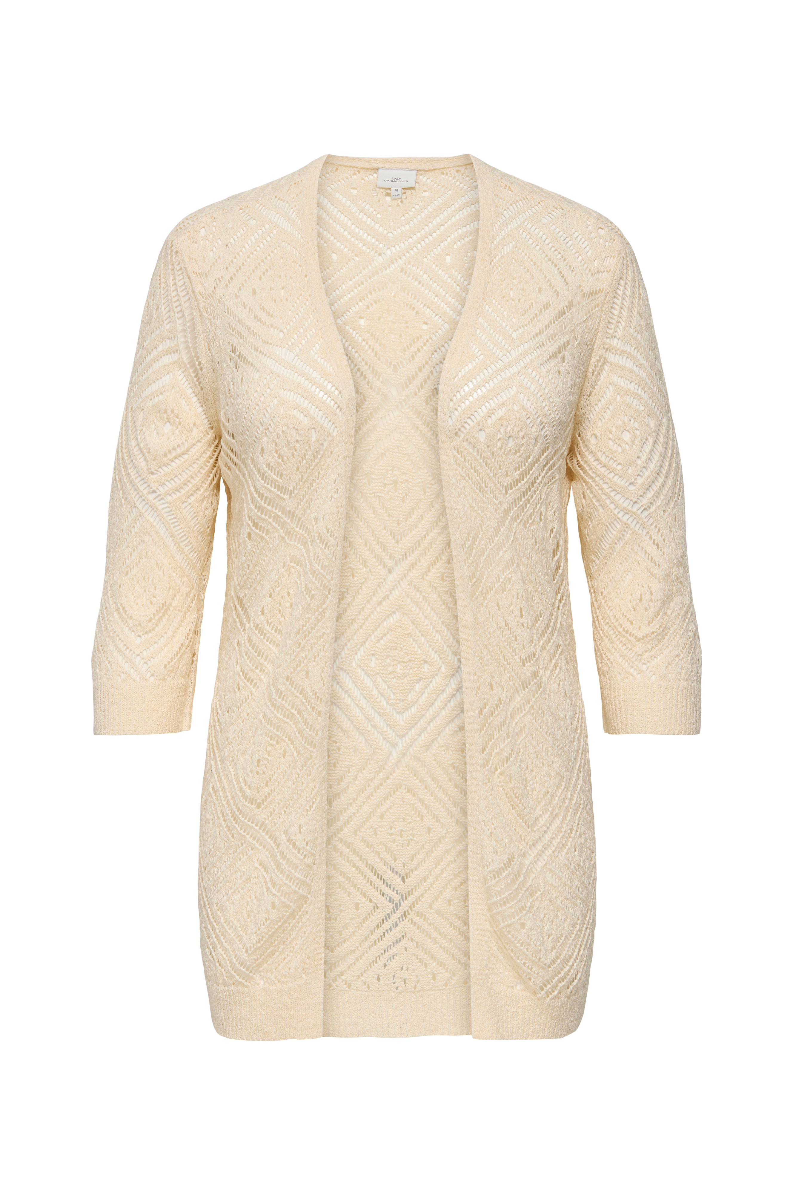 • Løststrikket cardigan med hulmønster• 3/4 lange ærmer• Åben, uden knaplukning forside• Ribstrik ved manchetterne og nederst• Store størrelser