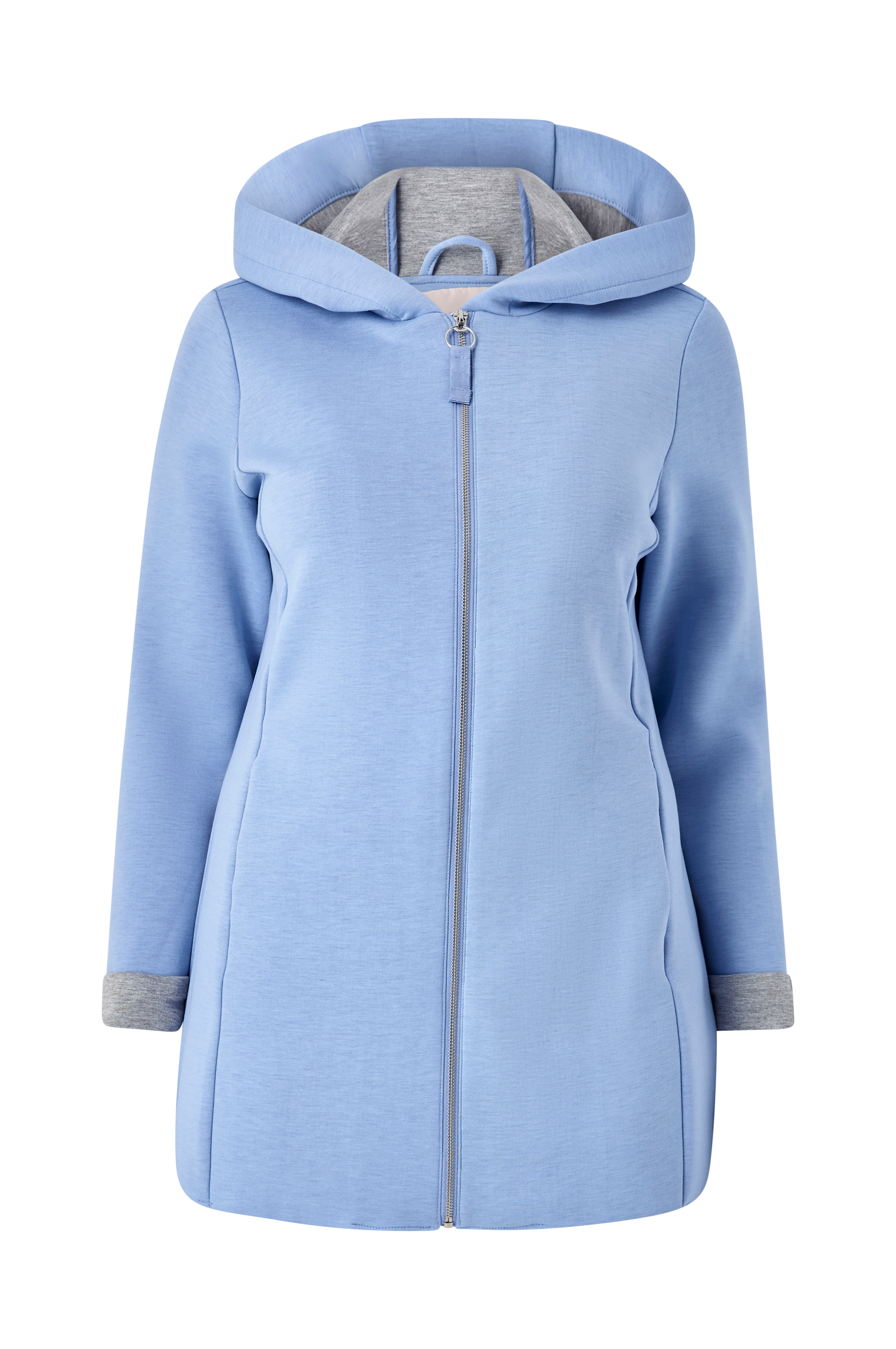 Plusstørrelser.Lidt tyndere model i dobbeltstrikket jersey med grå inderside. Stor hætte og lang lynlås foran. Fast opslag i ærmekanterne og indsatte lommer foran.Længde 82 cm i str. S.