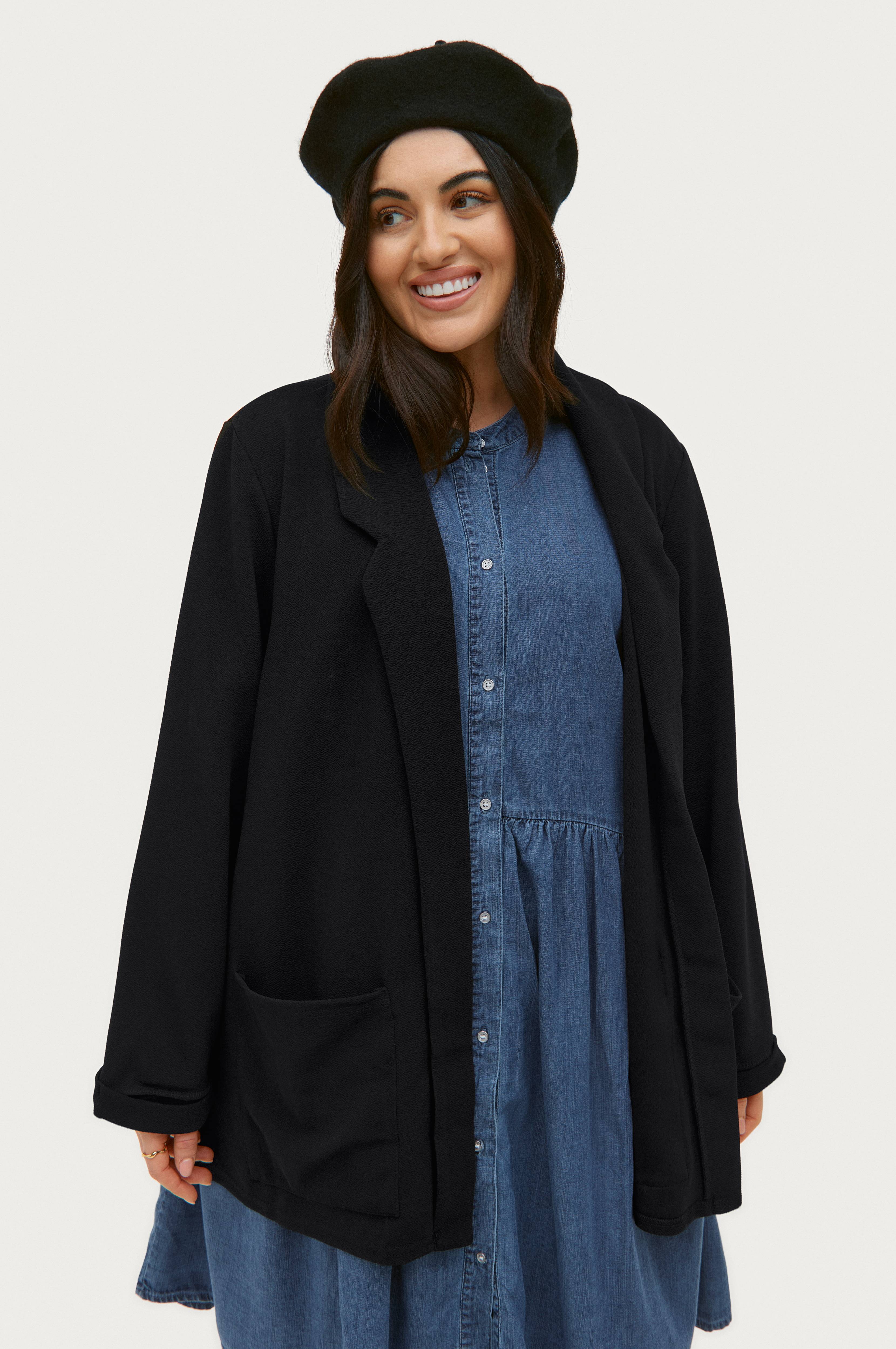 • Åben model• Lommer foran• Syede ærmeafslutninger• Fremstillet af jersey med struktur• Store størrelser