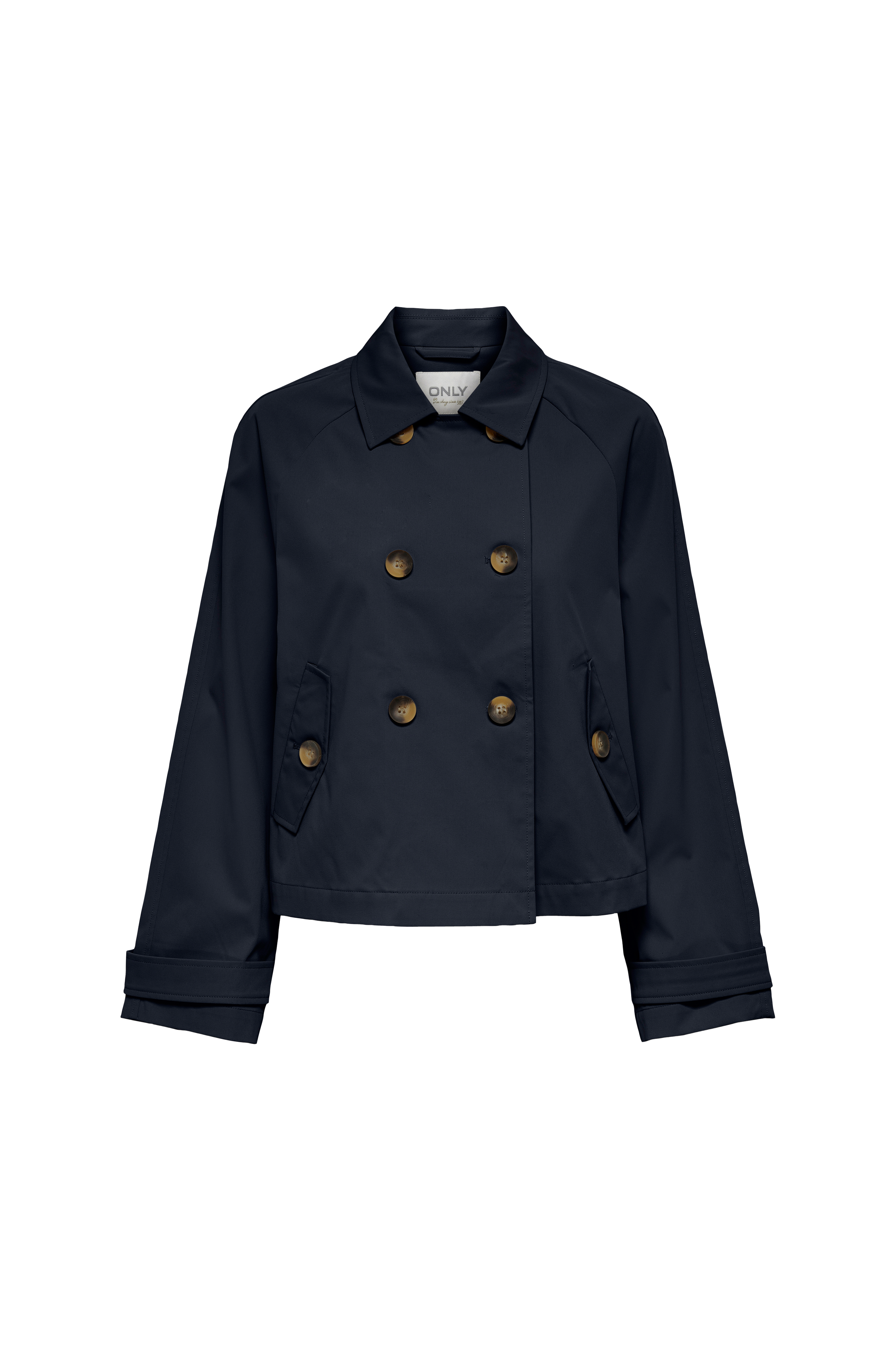 • Kort trenchcoat• Dobbeltbrystet model• Knapdetaljer ved manchetterne• To lommer med knapbare lommelåg• Store størrelser• Længde: 63 cm i størrelse 42/44