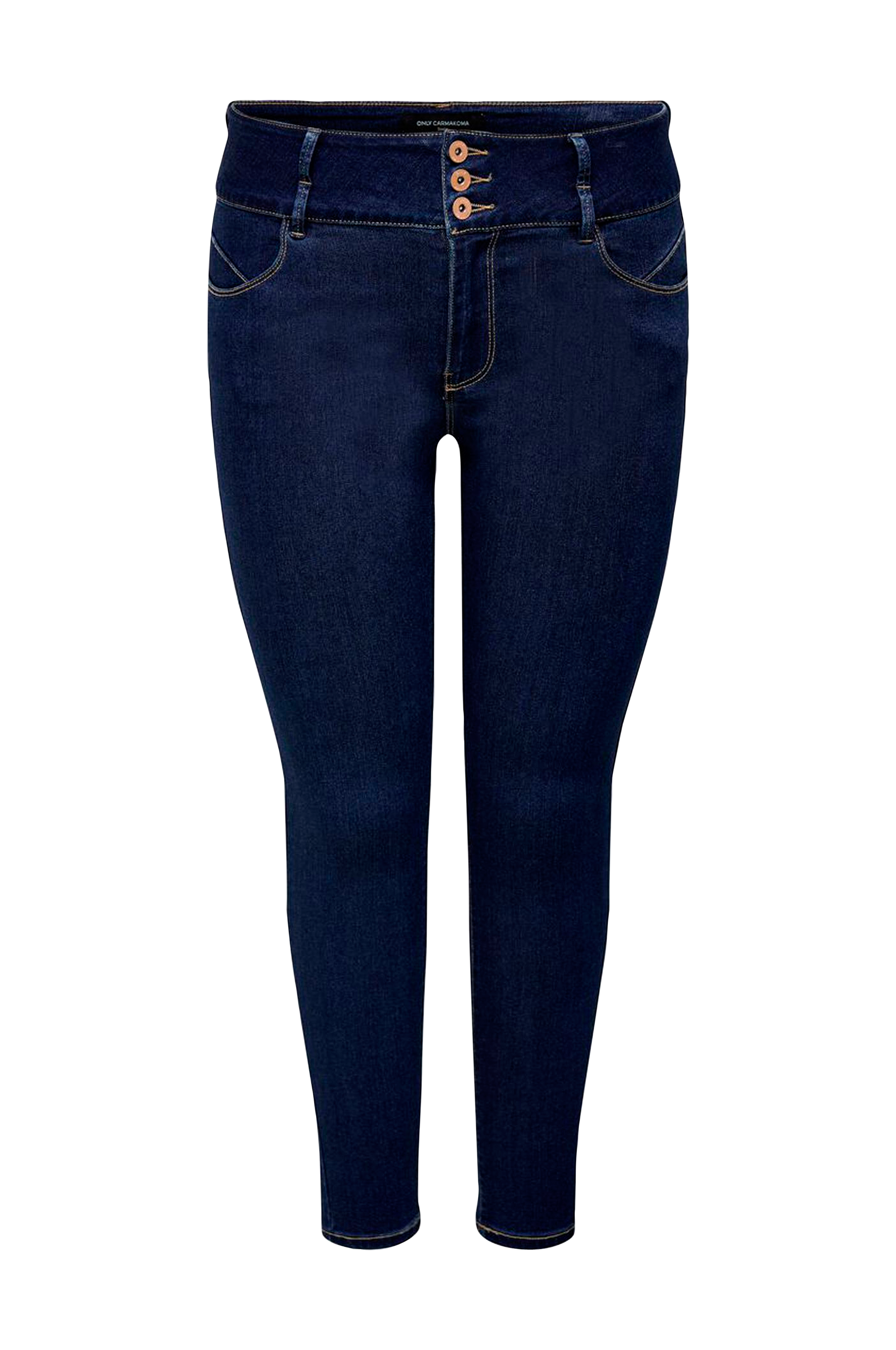 • Store størrelser• Tynd model i strækdenim• Høj talje med lynlås og knapper foran• Lommer bagpå• Påsyede baglommer• Smalle benafslutninger