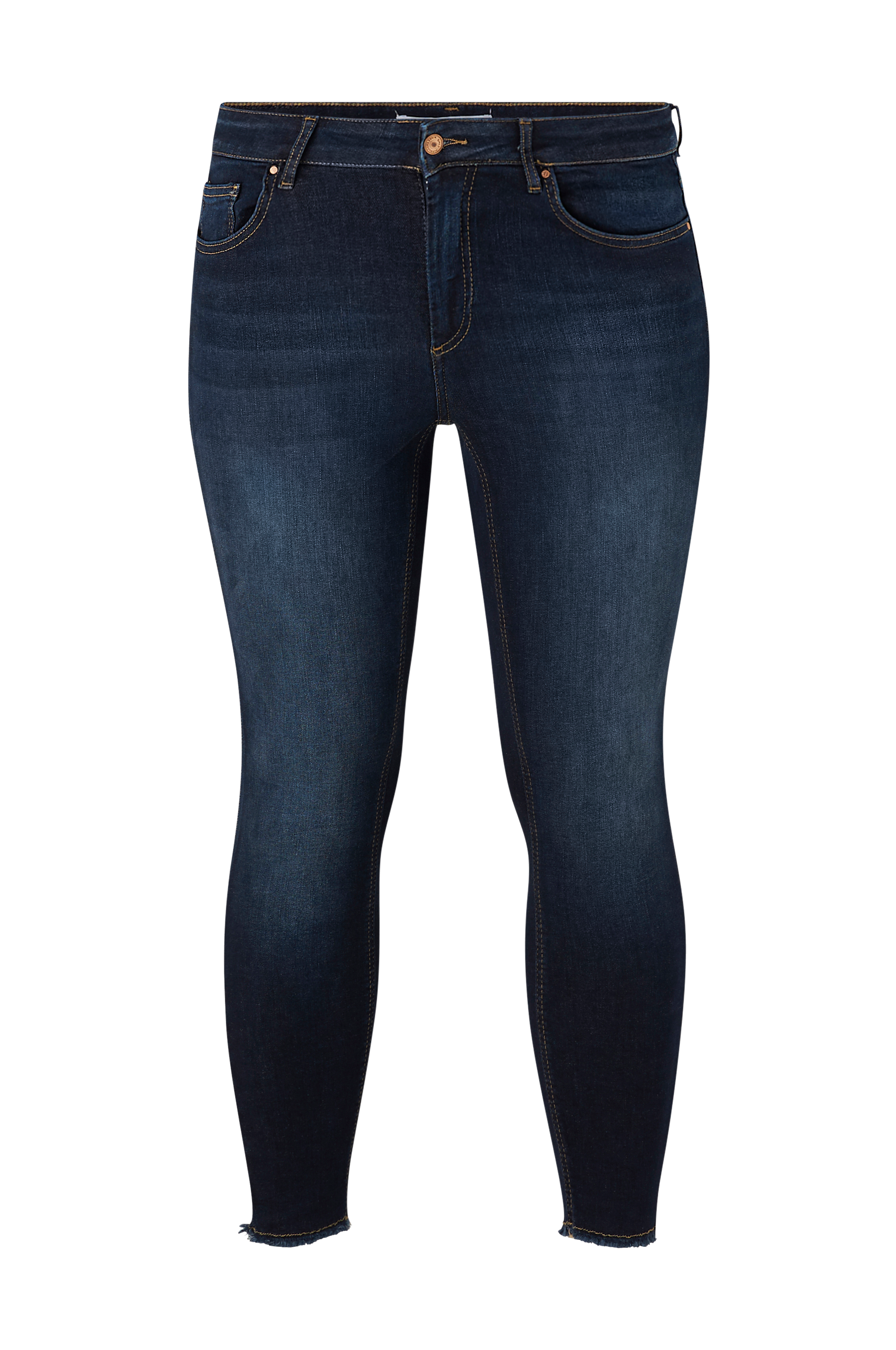 Jeans carWilly Life Reg Sk Ank Raw fra Only Carmakoma. Model i normal pasform med smalle bukseben med rå kant. Fem jeanslommer og lynlås i gylpen.