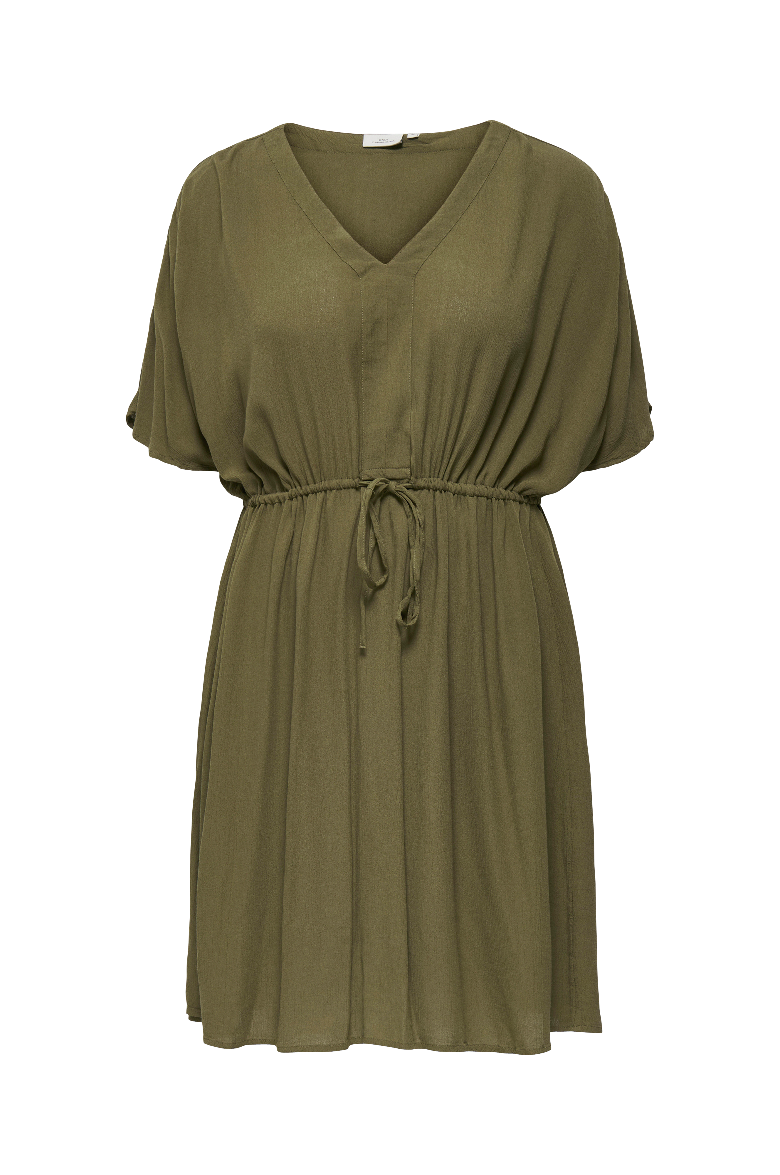 • Store størrelser• Bred, lige model i crepe• V-formet halsudskæring• Nedsænket skulder med kort ærme• Træksnørre ved taljen• Længde: 107 cm i størrelse 42
