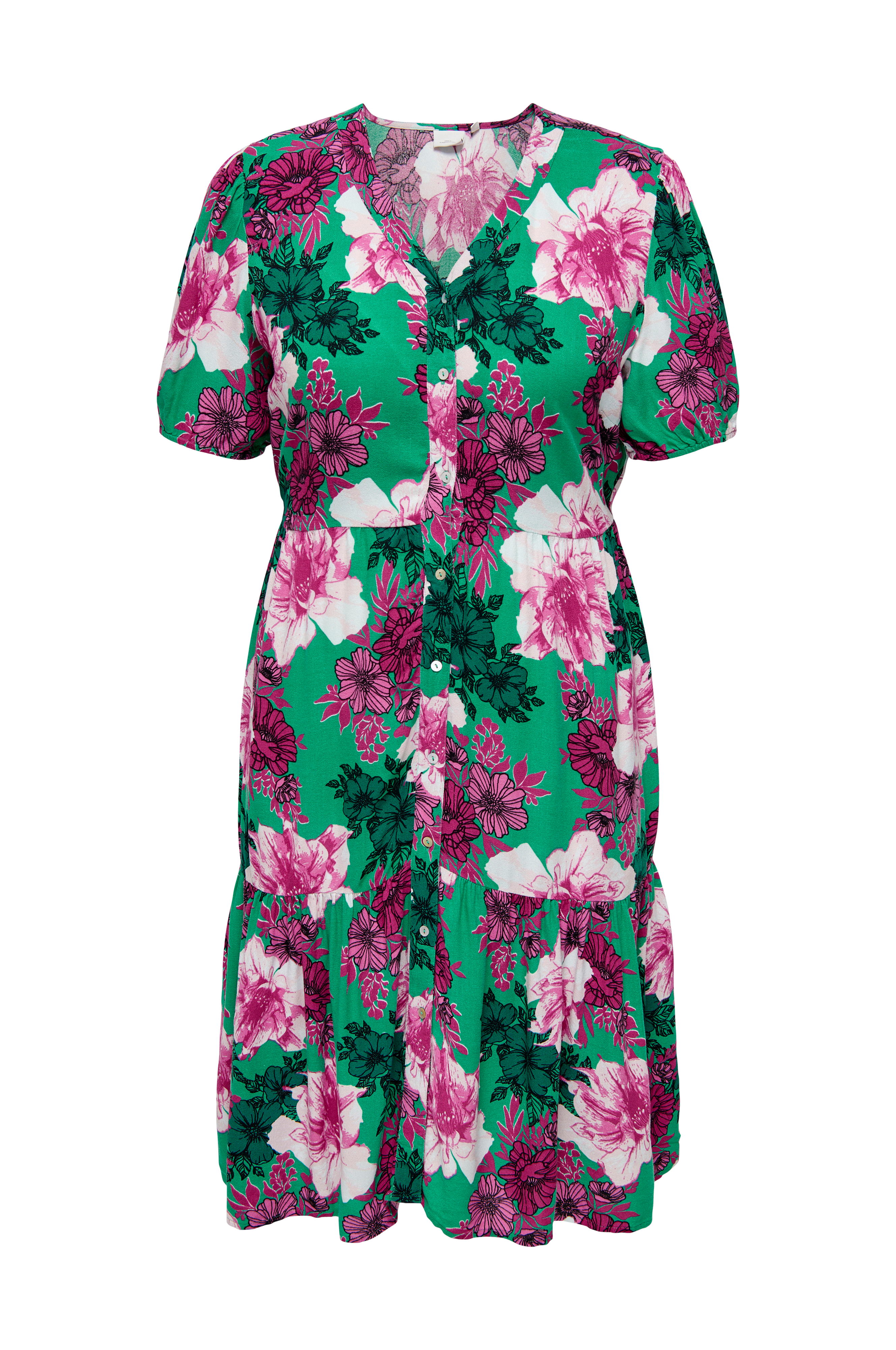• Mønstret kjole i viskose• V-udskæring• Knapper foran• Korte ballonærmer• Volant nederst• Store størrelser• Længde: 113 cm i størrelse 42