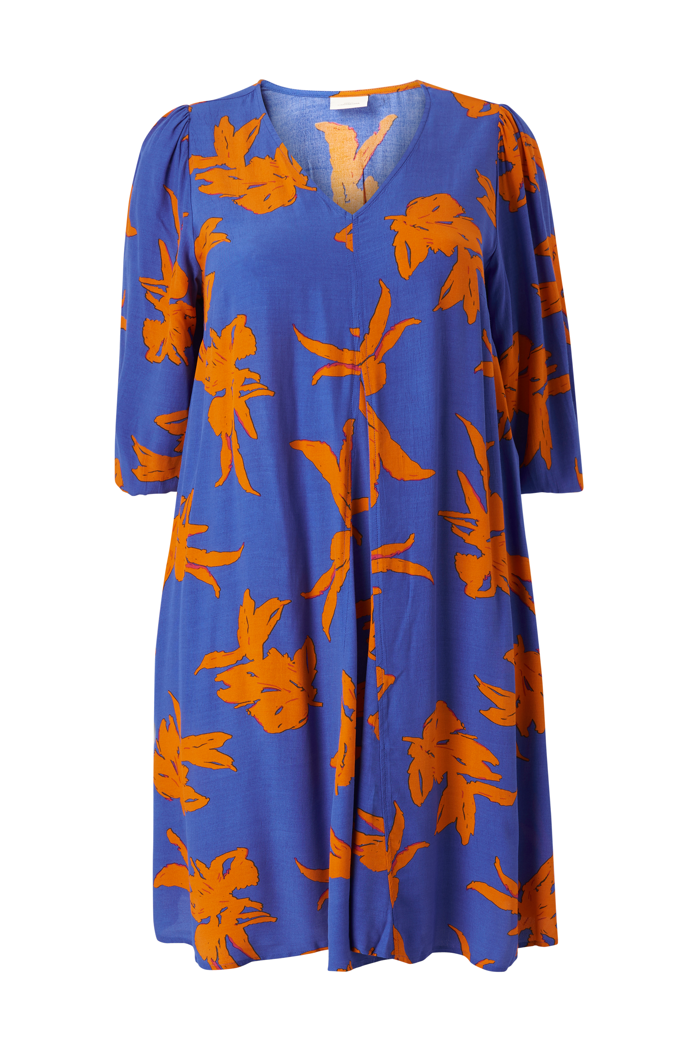 • Store størrelser• Model med svaj• V-formet halsudskæring• 3/4 langt, lige pufærmer med elastisk manchet• Syet i folder bokslæg midt foran• Længde: 103 cm i størrelse 42