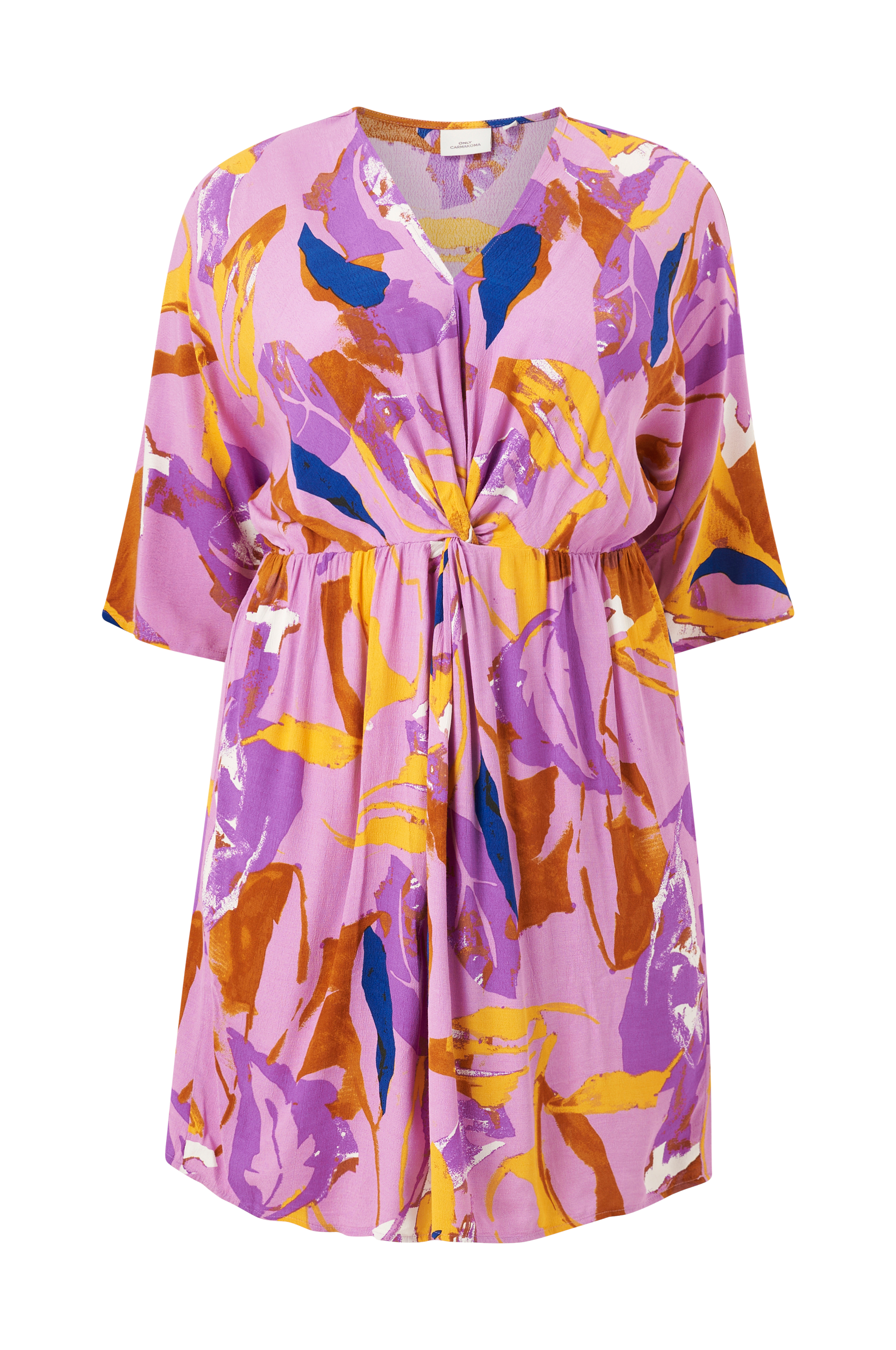 • V-udskæring• 3/4 lange ærmer• Elastisk talje med knudedrapering foran• Store størrelser• Længde: 100 cm i størrelse 42