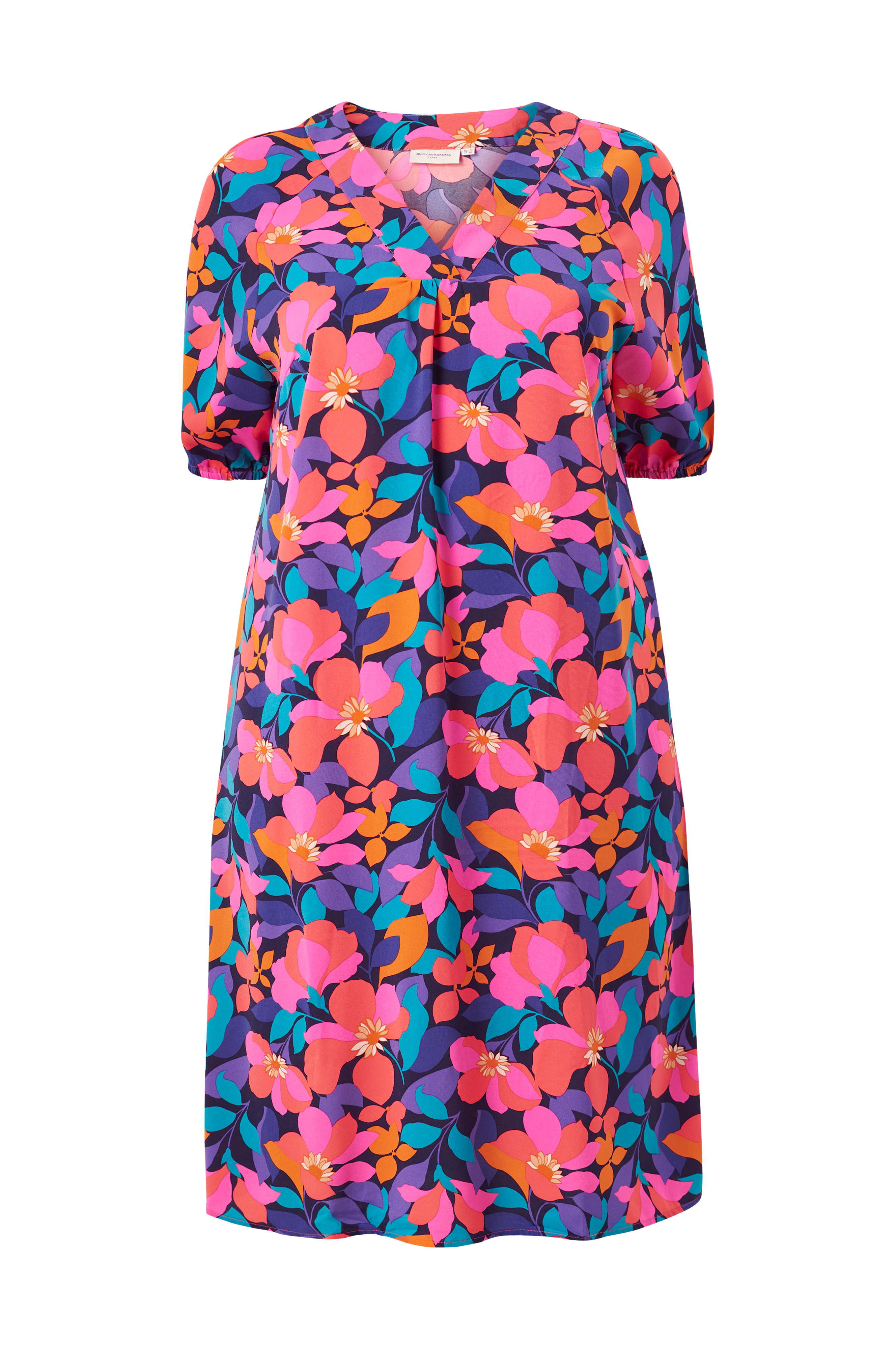 • V-formet halsudskæring• Korte ærmer med elastisk bånd ved manchetterne• Flæset detalje foran• Store størrelser• Længde: 111 cm i størrelse 42