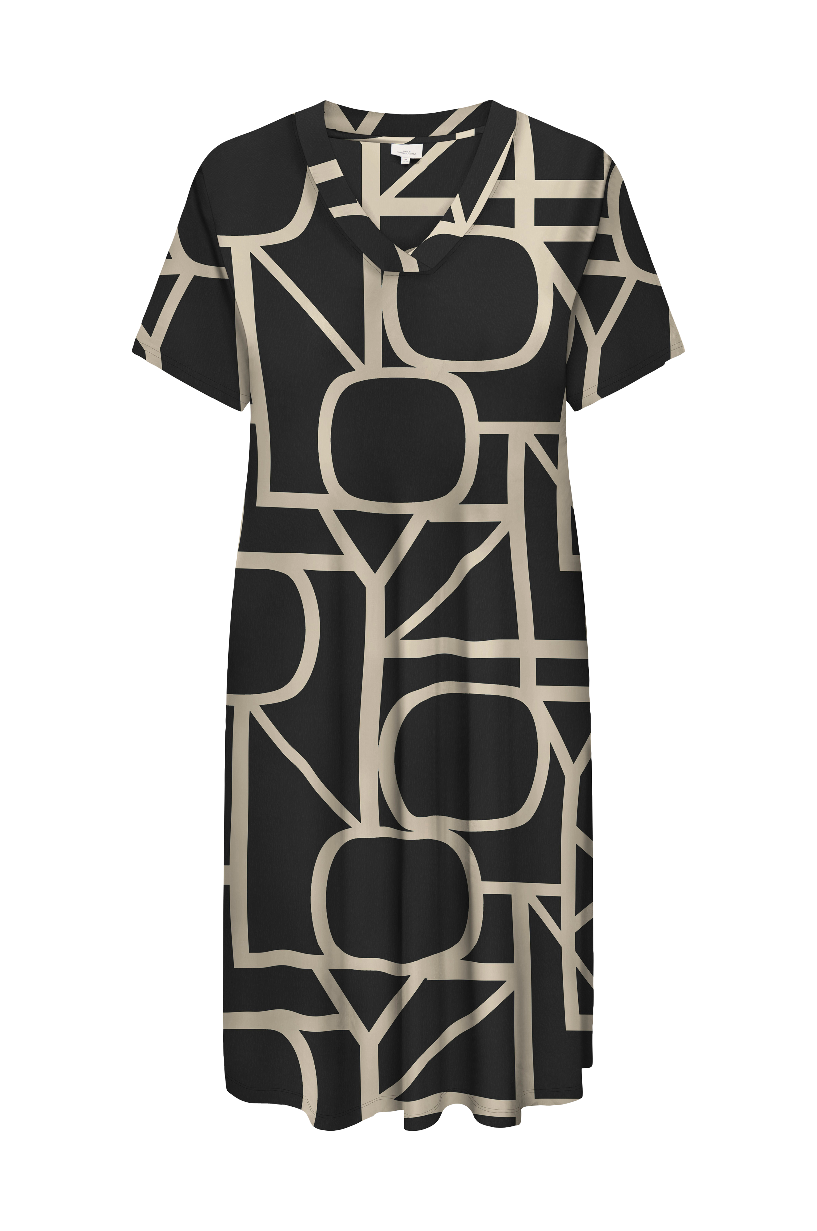 • Kjole i elastisk bomuldsjersey• V-formet halsudskæring• Korte ærmer• Store størrelser• Længde: 117 cm i størrelse 42/44