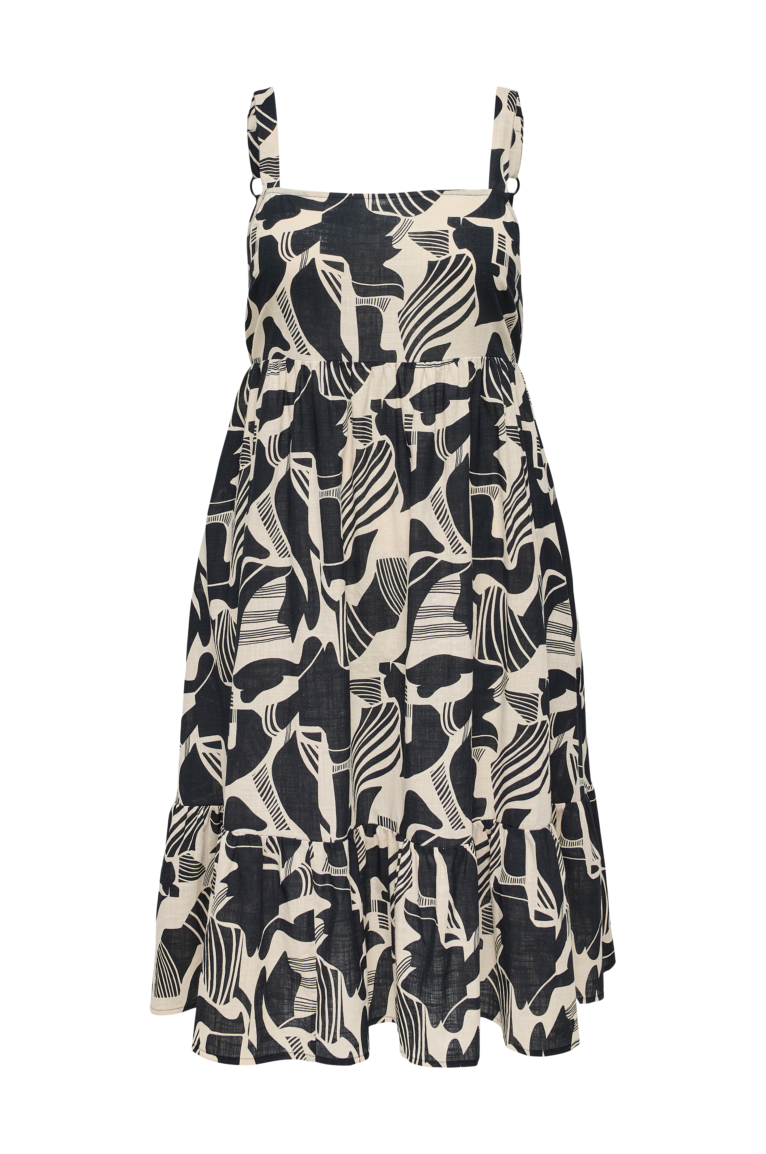 • Store størrelser• Ærmeløs model med svaj• Kantet halsudskæring• Justérbare skulderstropper• Markeret talje• Volant ved nederste kant• Længde: 116 cm i størrelse 42