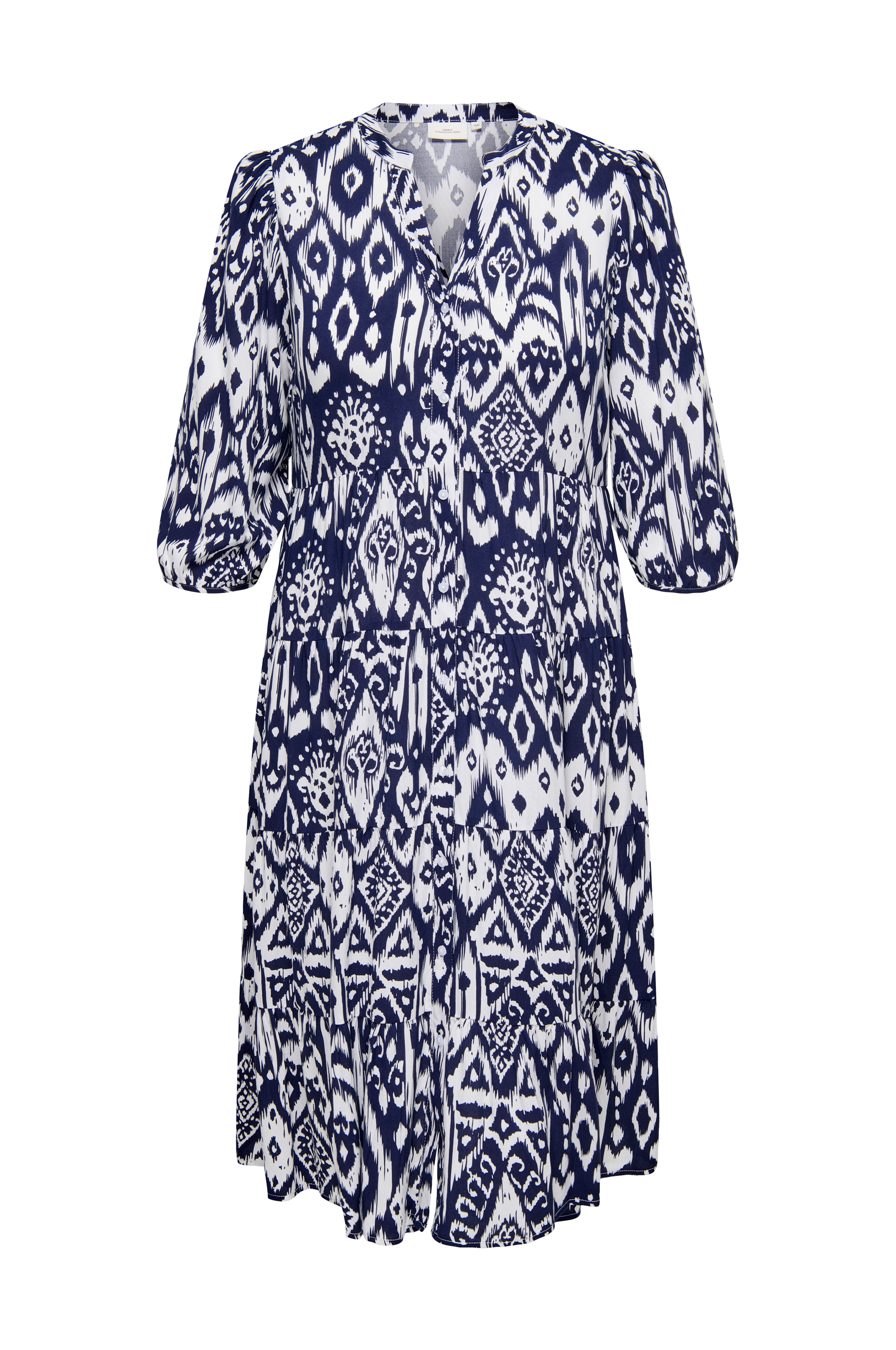 • Kjole i viskose med printet mønster• V-formet halsudskæring• Knapstolpe hele vejen frem• Halvlange ærmer• Store størrelser• Længde: 117 cm i størrelse 42