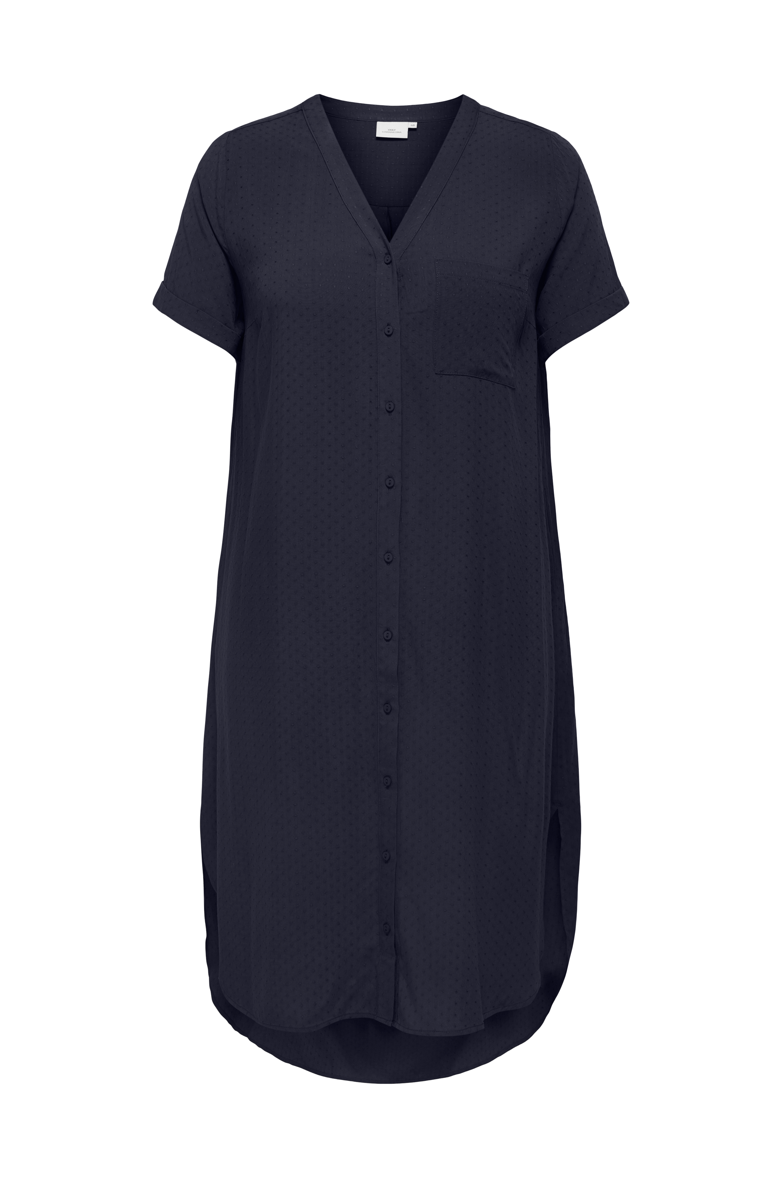 • Kjole i viskose • Prikket struktur • V-udskæring • Korte, foldede ærmer • Knapstolpe hele vejen frem • En brystlomme • To sidelommer • Afrundet søm med slids i siderne • Længde: 119 cm i størrelse 42