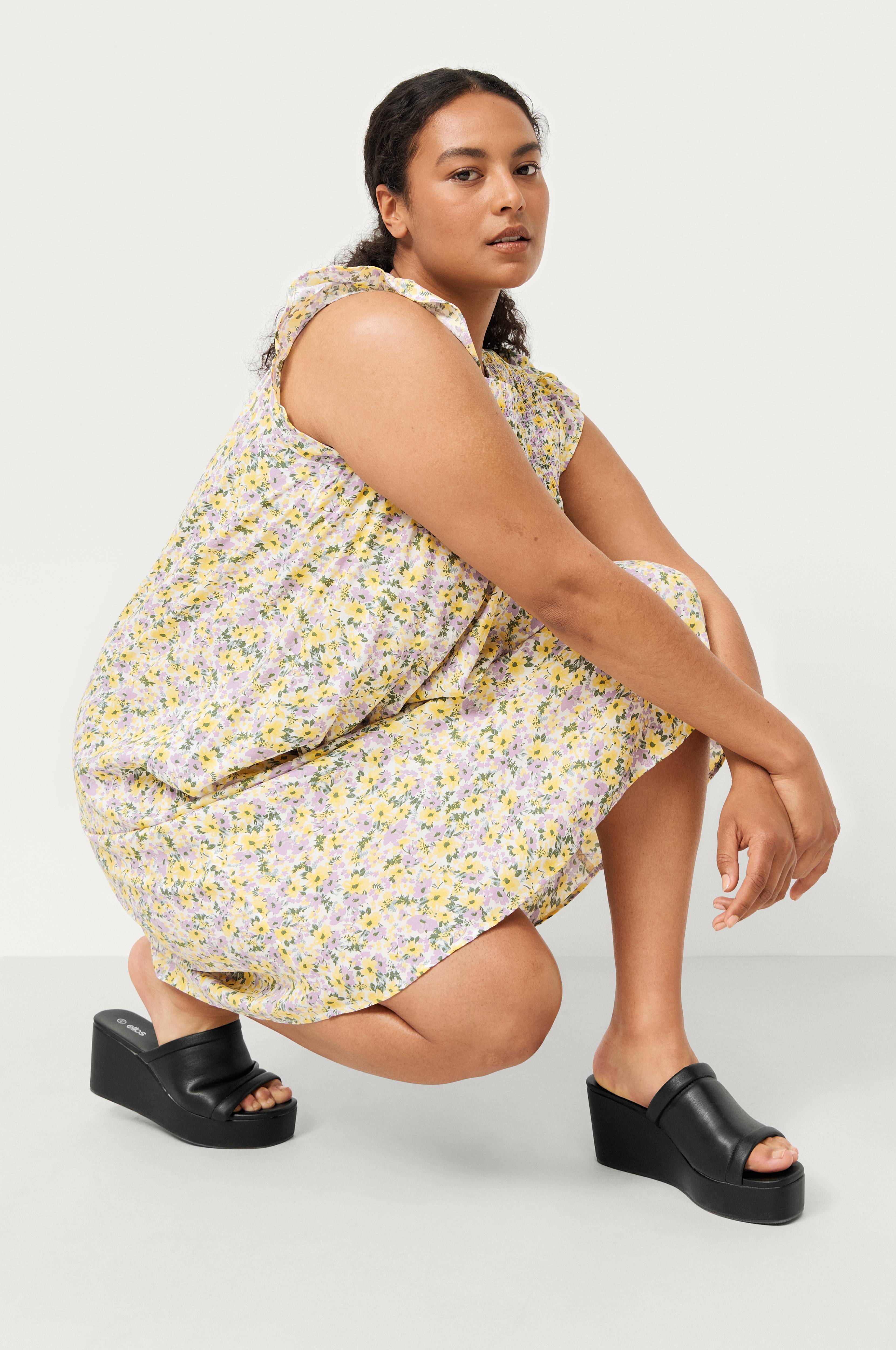 • A-linje design• Korte flagrende ærmer• Smock oppe foran• Ventilation med knap bagpå• Rynket søm i ryggen• Længde: 110 cm i størrelse 44