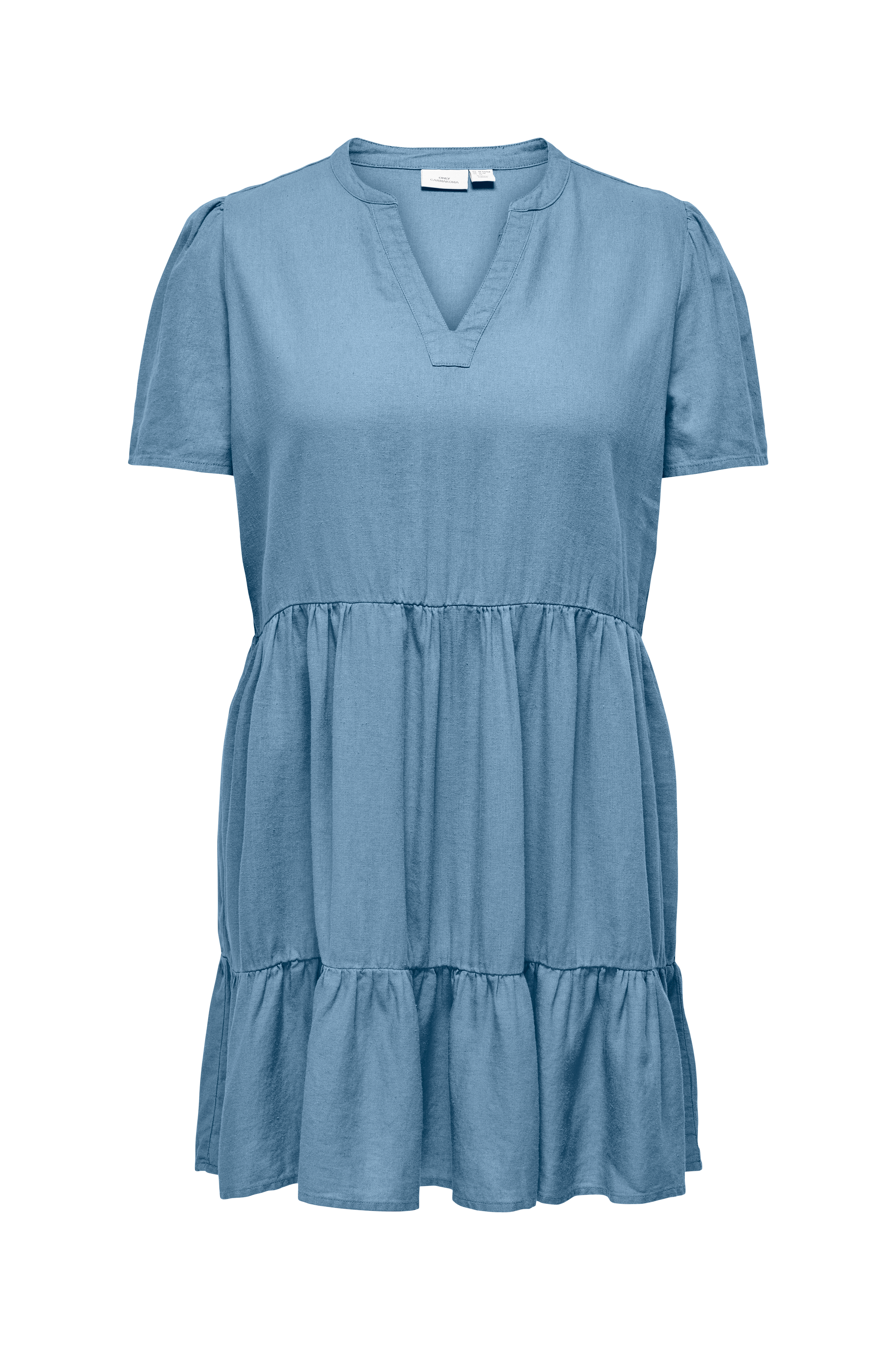 • Store størrelser• Model med svaj med rynket talje• V-udskæring• Kort ærme• Volant ved nederste kant• Længde: 91 cm i størrelse S