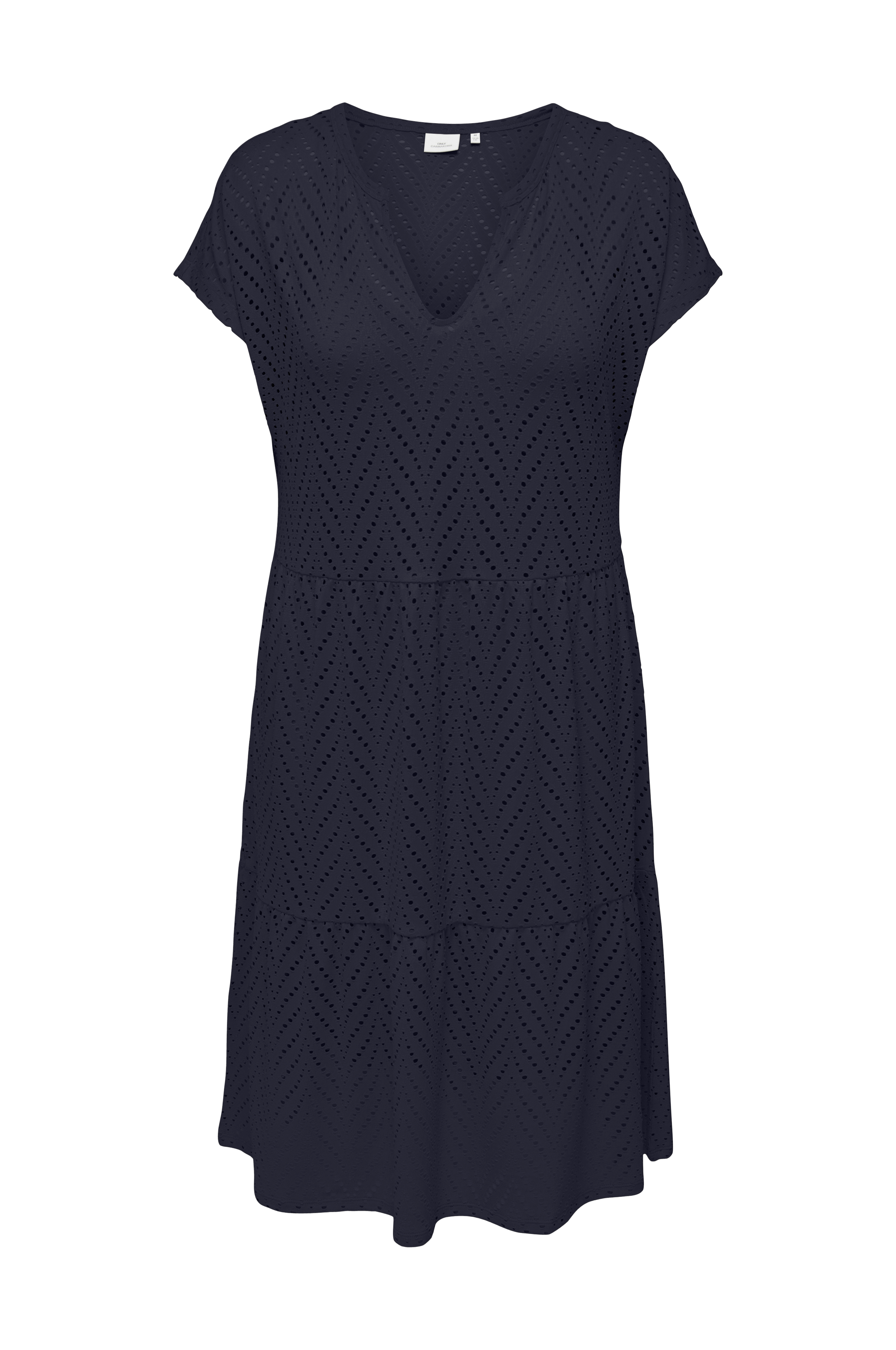 • Hulmønstret kjole• V-udskæring• Nedsænkede skuldre• Korte ærmer• Bred volant ved nederste kant• Store størrelser• Længde: 116 cm i størrelse S