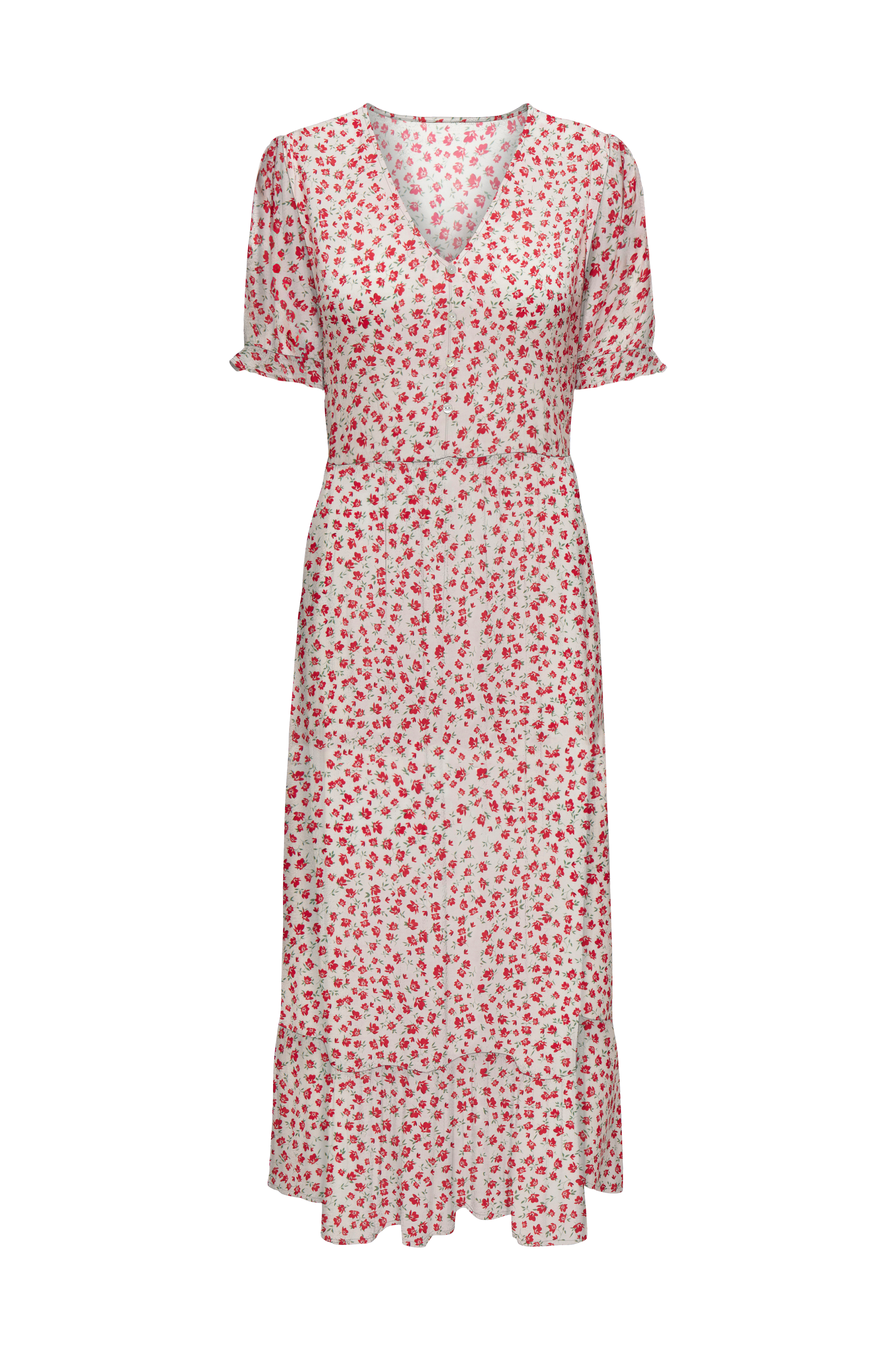 • Lang kjole i rynket viskose• V-udskæring• Dekorative knapper oppe foran• Korte ballonærmer med volant ved manchetterne• Elastisk talje• Volant nederst• Store størrelser• Længde: 139 cm i størrelse 42