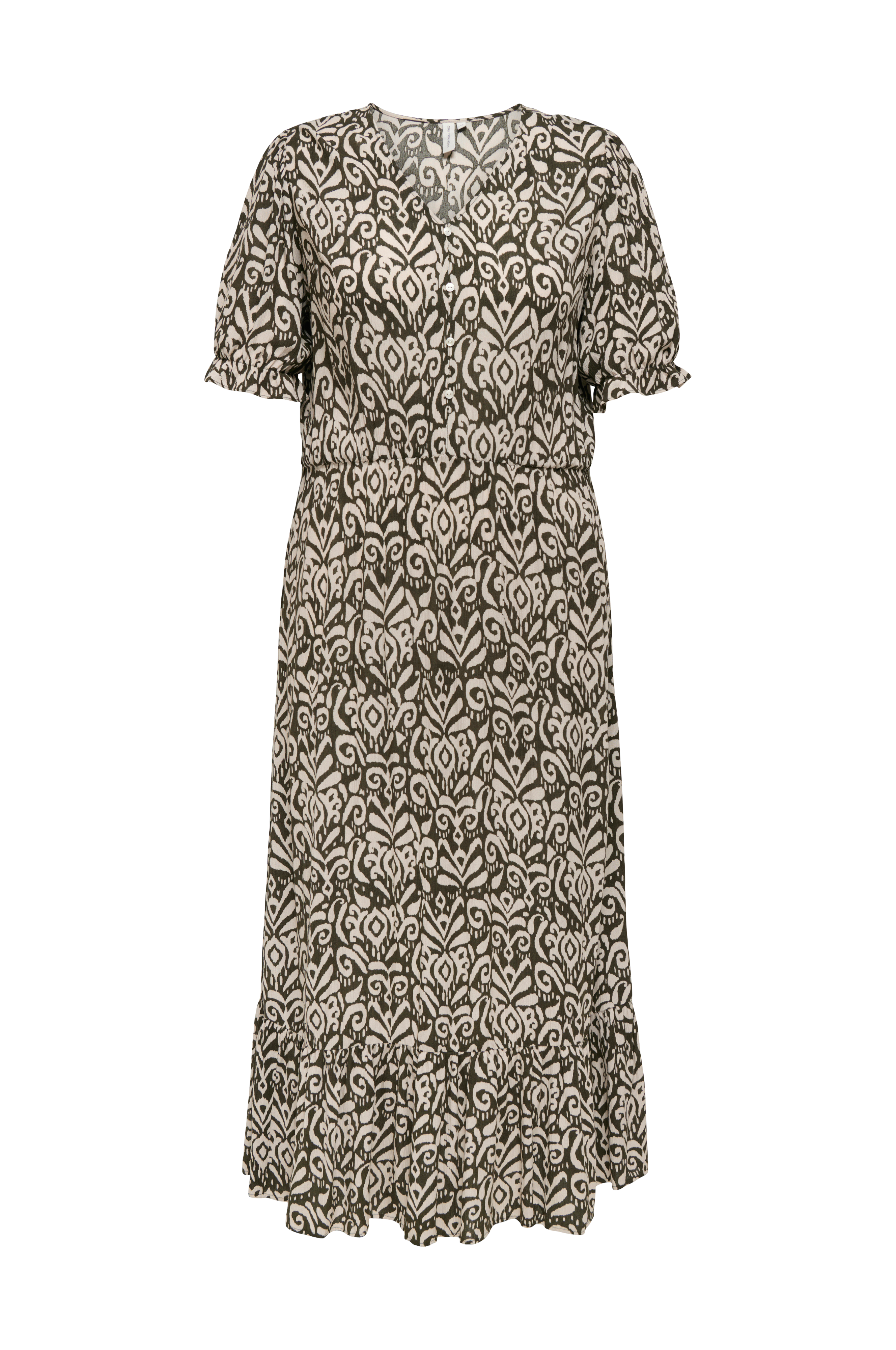 • Lang kjole i rynket viskose• V-udskæring• Dekorative knapper oppe foran• Korte ballonærmer med volant ved manchetterne• Elastisk talje• Volant nederst• Store størrelser• Længde: 139 cm i størrelse 42