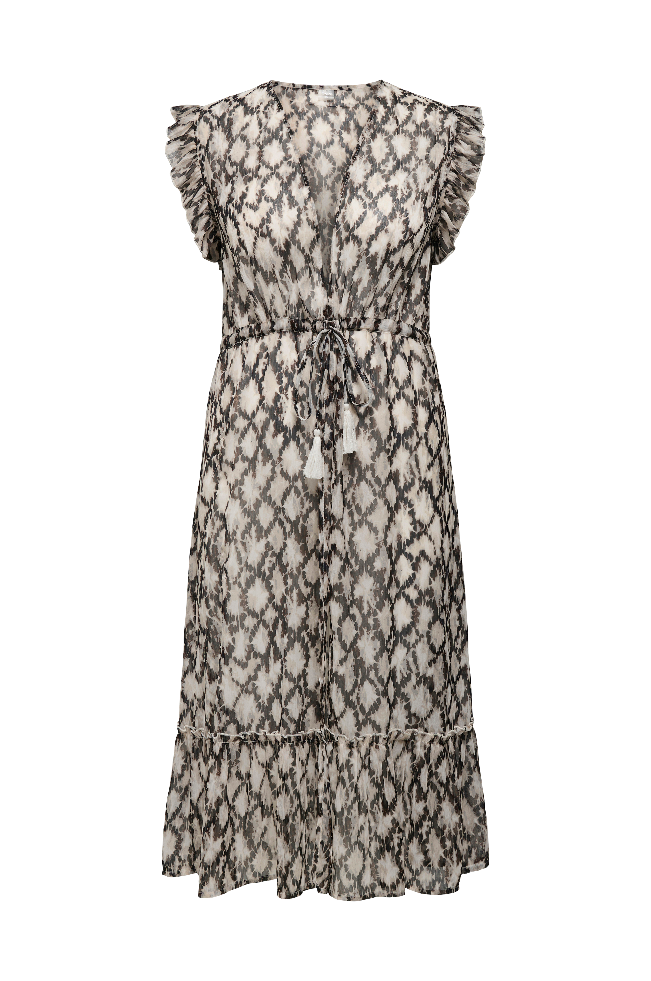 • Strandkjole i chiffon• V-udskæring• Korte ærmer med flæsekant• Snørelukning ved taljen• Bred volant ved nederste kant• Normal pasform• Store størrelser• Længde: 131 cm i størrelse S/M