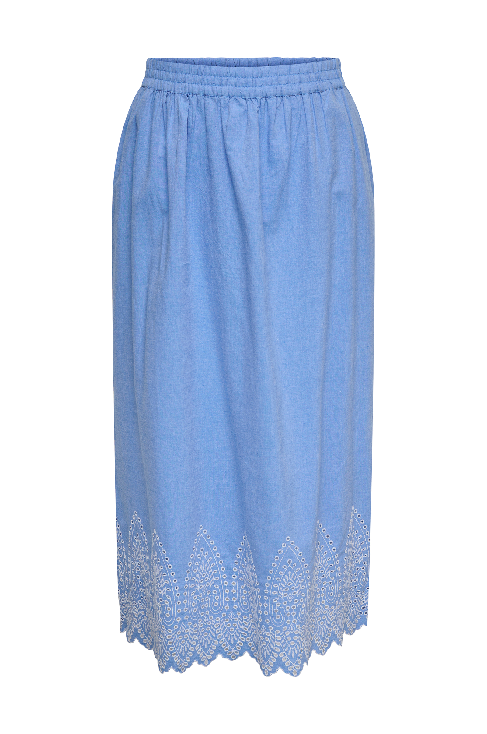 • Broderet hulmønster nederst• Elastisk talje• Lommer i siderne• Længde: 92 cm i størrelse 42• Plusstørrelser