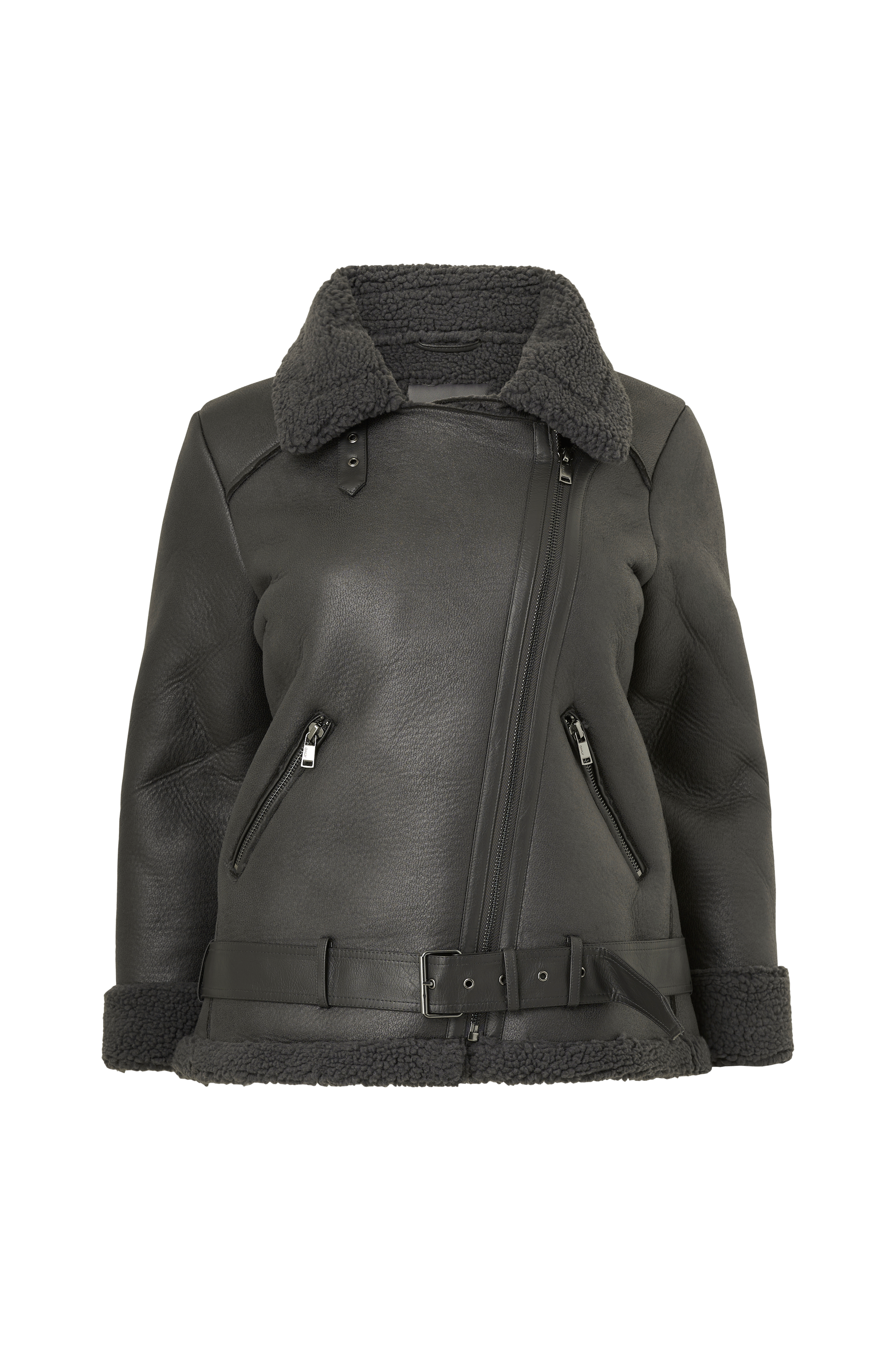 • Jakke i imiteret læder med teddyforing• Asymmetrisk lynlås• To lynlåslommer• Bælte ved nederste kant• Store størrelser• Længde: 70 cm i størrelse S